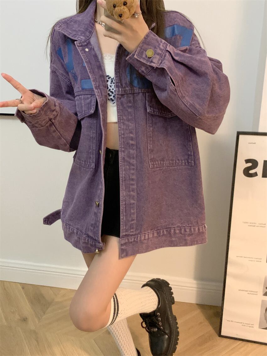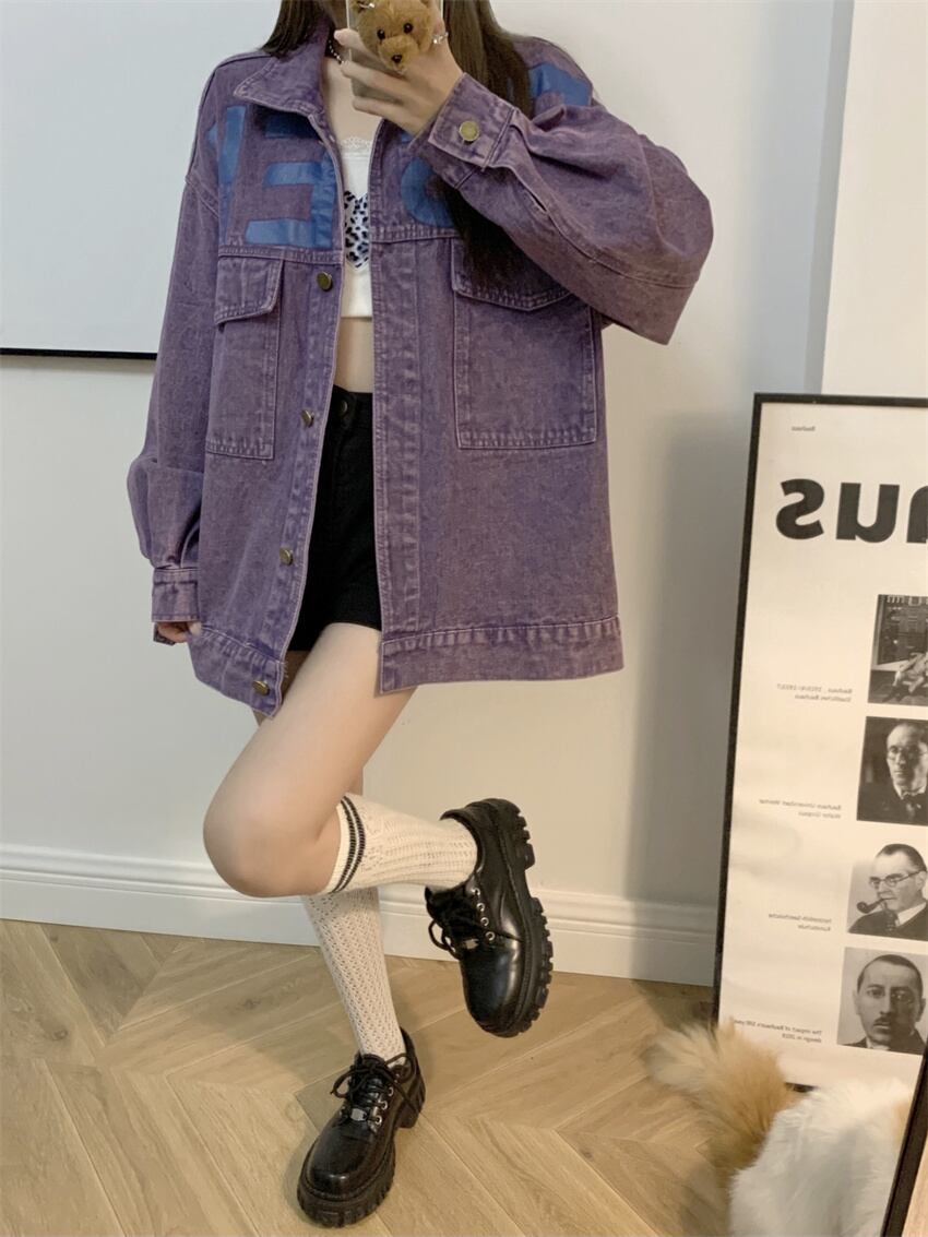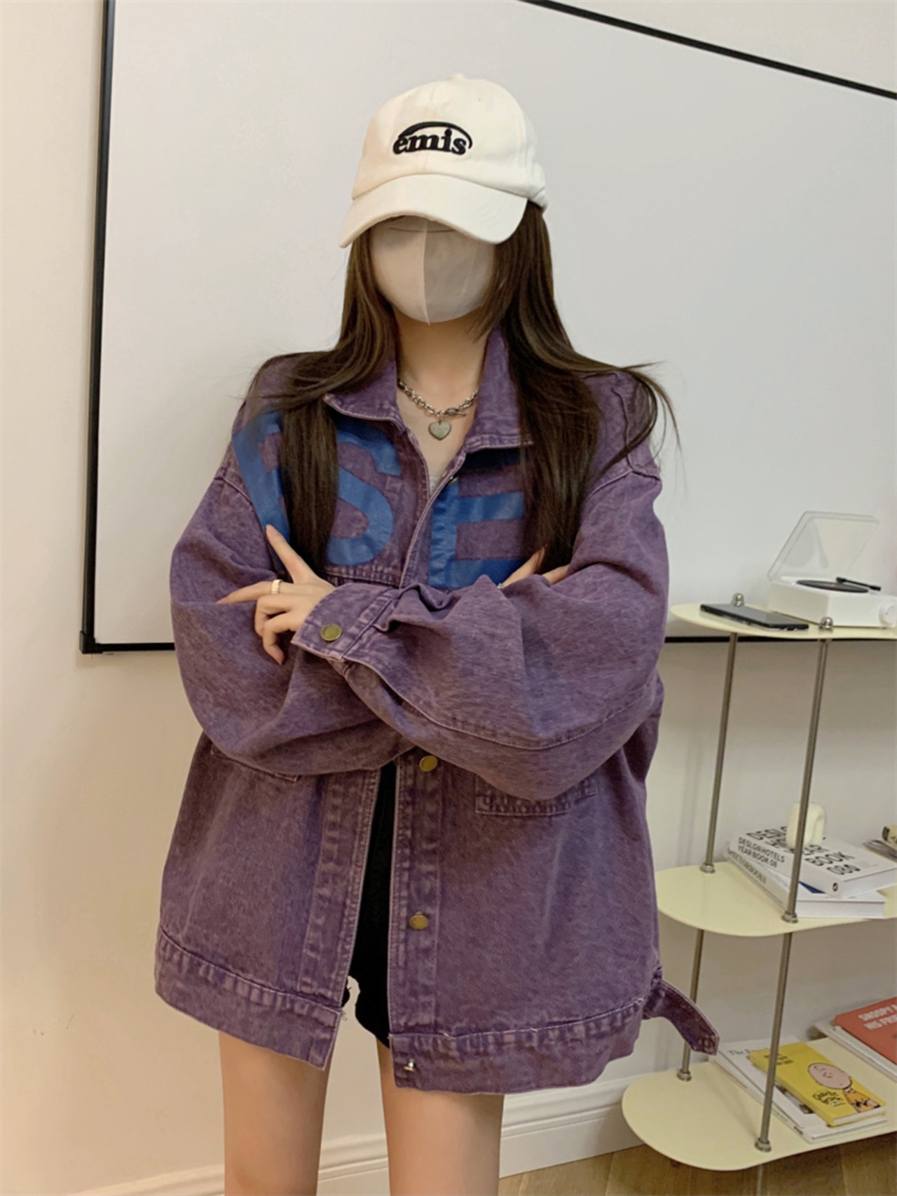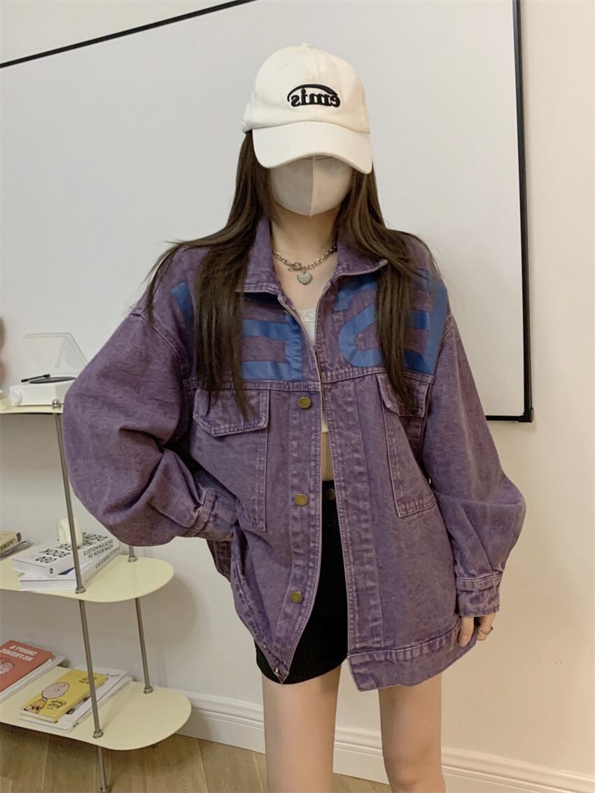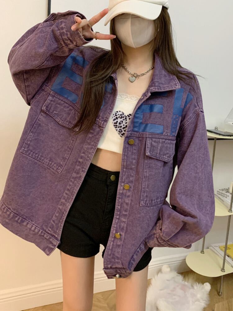 [EWQ] パープルコートレタープリントポケットデニムジャケット春秋シングルブレストジャケットコート 16Y6549 スプリング 春物 オータム 秋物