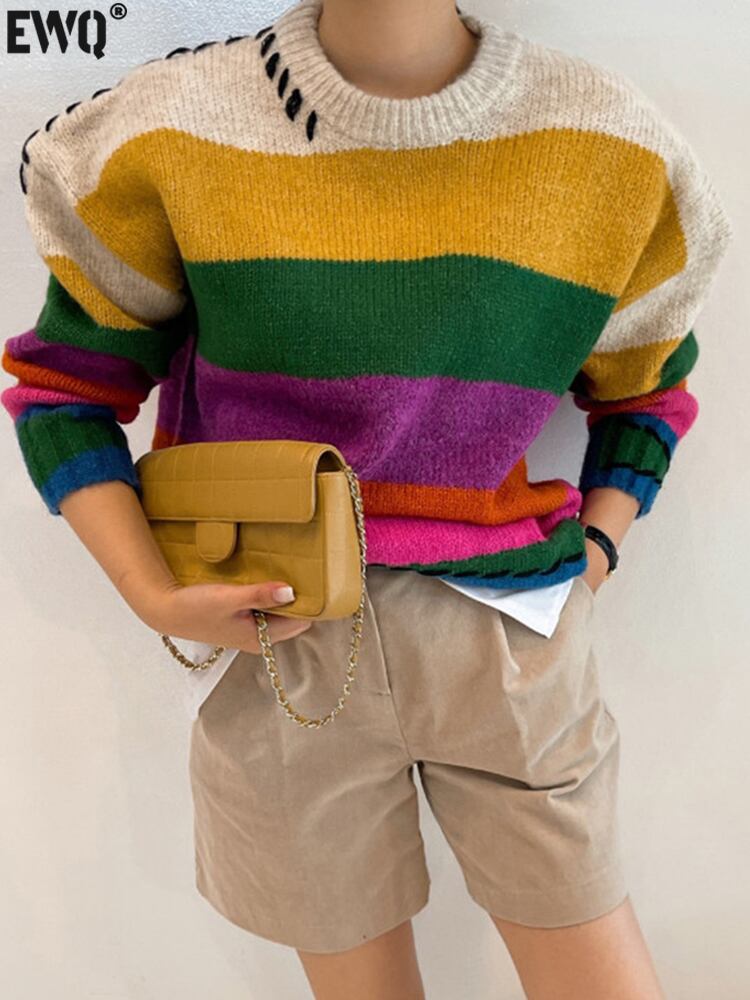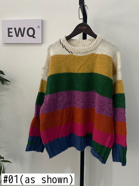 [EWQ] コントラストカラー ストライプ プルオーバー レディース ゆったり Oネック 長袖 ニットセーター 春 16Y3667 ロング スプリング 春物