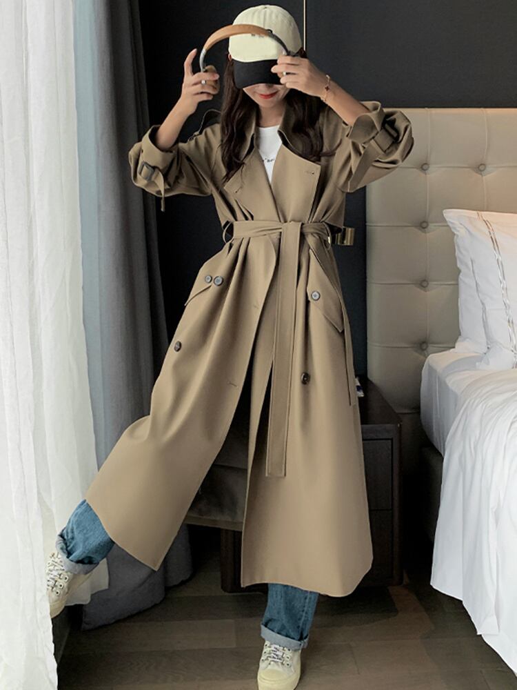 【EWQ】イレギュラートレンチコート レディース 春 無地 ラペル ダブルブレスト ロング ウインドブレーカー シック スプリング 春物 ソリッドカラー