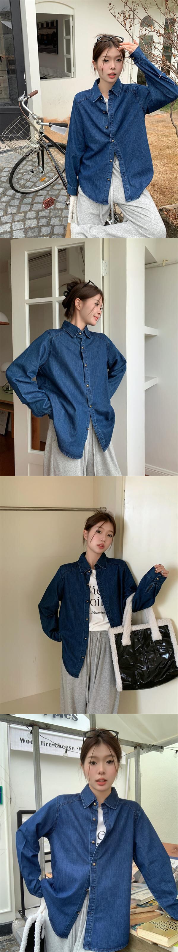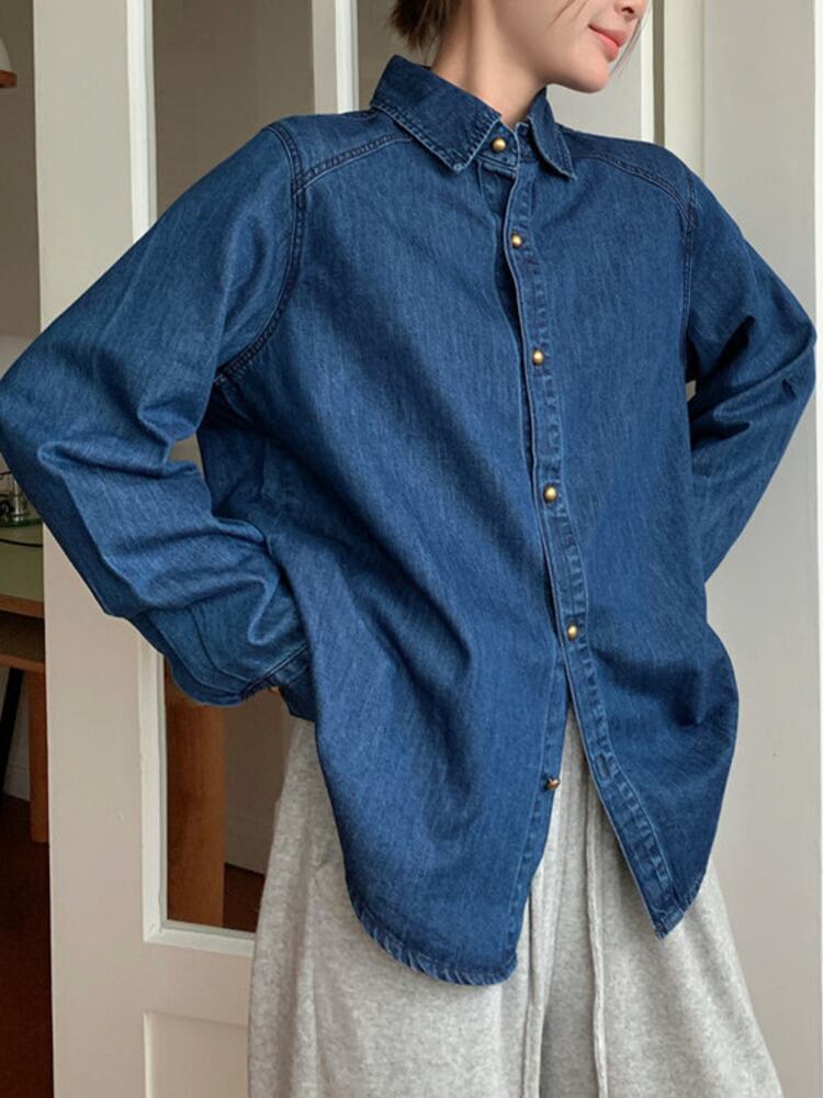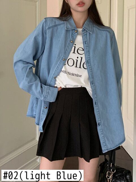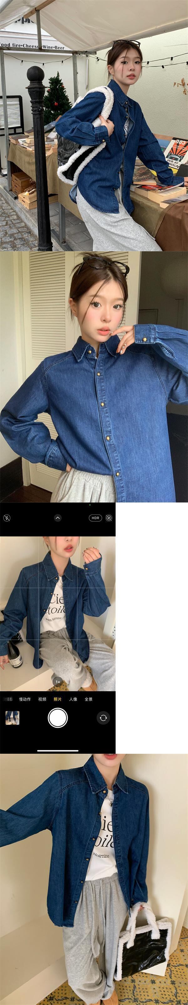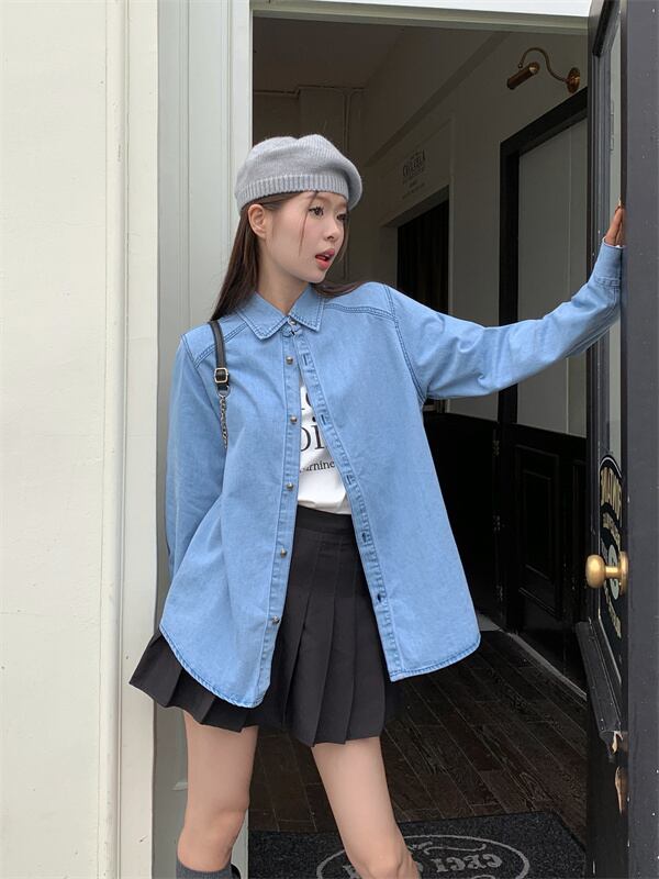 [EWQ] シングルブレストデニムシャツ長袖無地シックブラウス春秋レジャートップス 6611 ロング スプリング 春物 オータム 秋物 ソリッドカラー