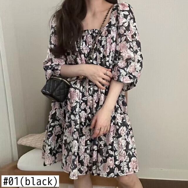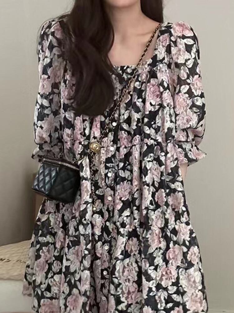 [EWQ] スクエア ネック シングル ブレスト花柄ドレスランタン スリーブ ミニ ドレス春夏コントラスト Vestido ランタンスリーブ スプリング 春物 サマー 夏物 スクウェア
