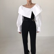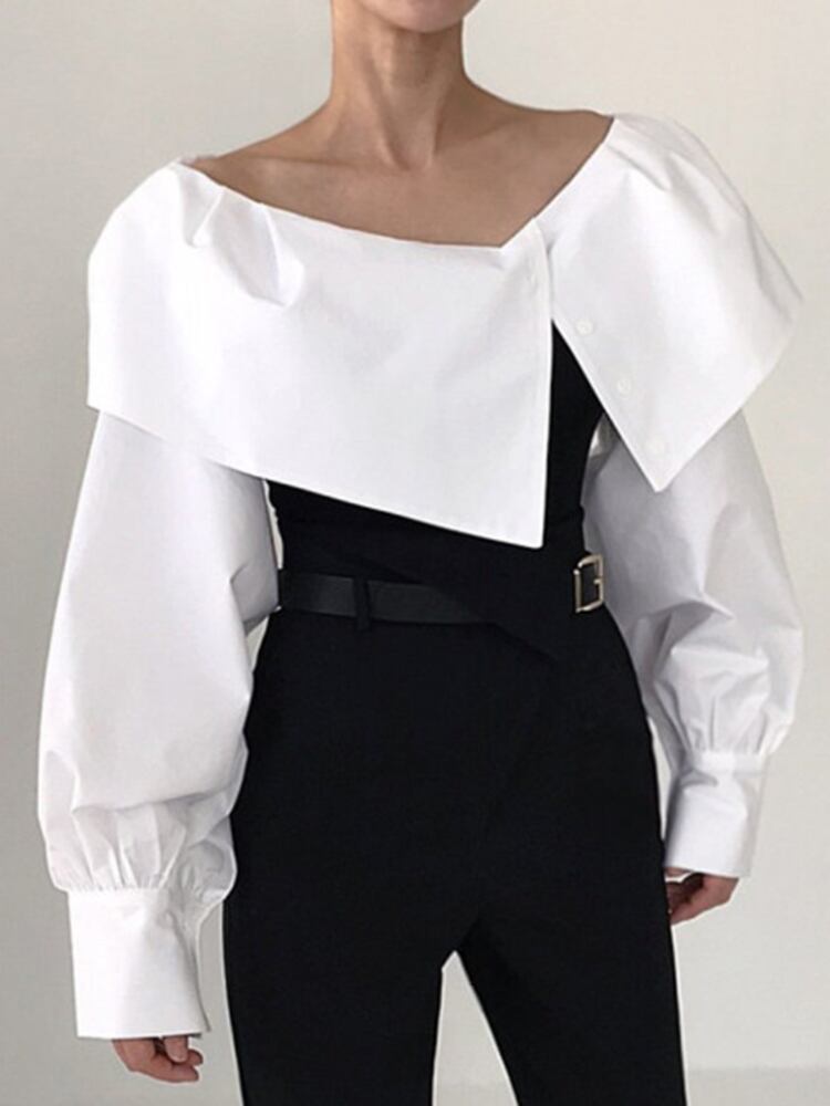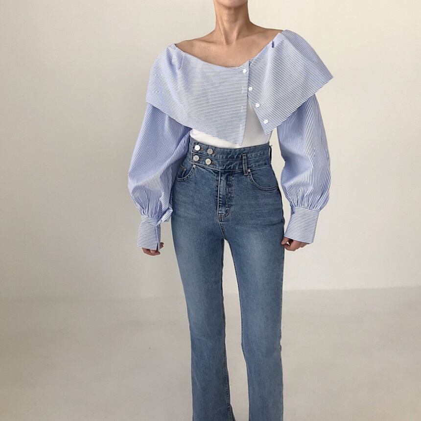 [EWQ] ストライプ コントラスト ラペル シャツ長袖パッチワーク シックボタン トップ春秋シャツ 6961 ロング スプリング 春物 オータム 秋物