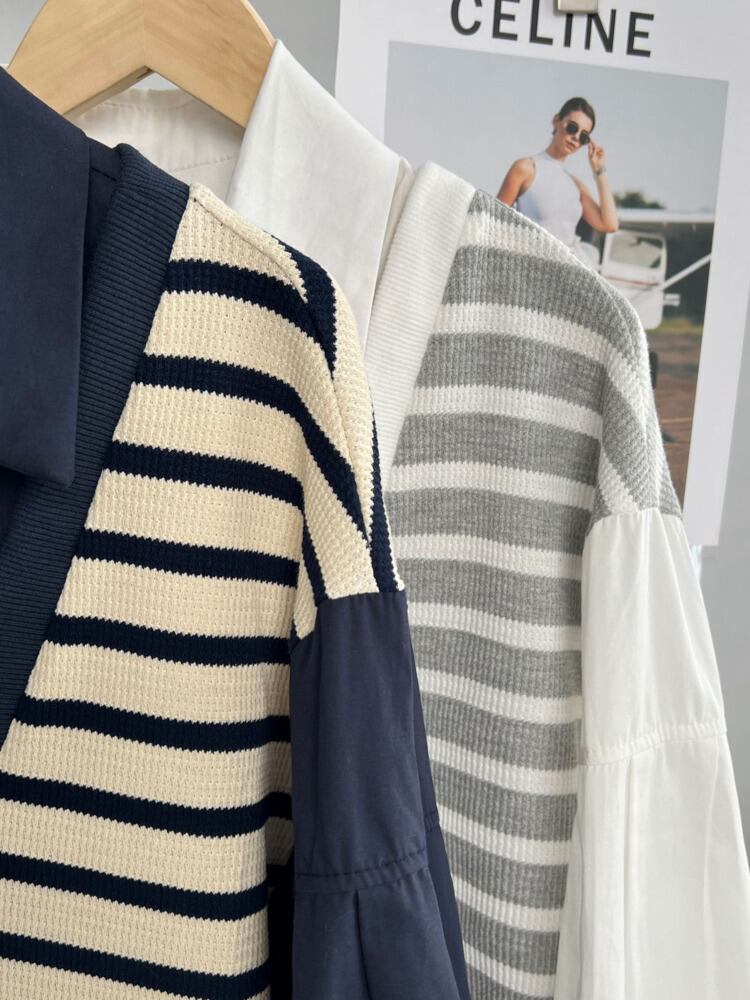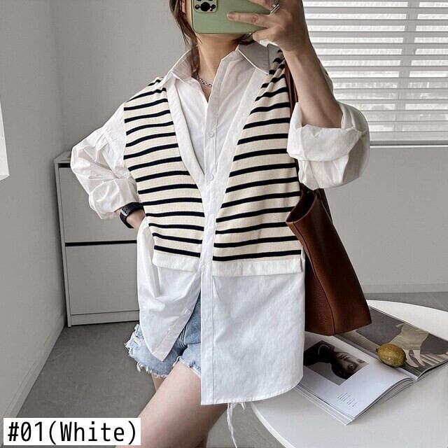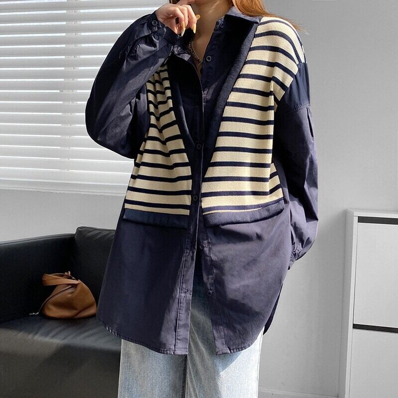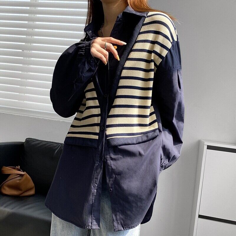 [EWQ] ニットストライプパッチワークシャツ春秋潮カラーコントラストスプライシングブラウスシャツトップス 16Y5964 スプリング 春物 オータム 秋物