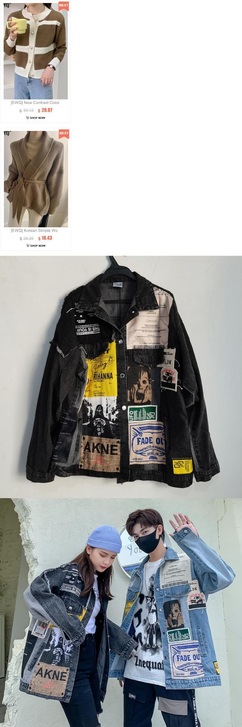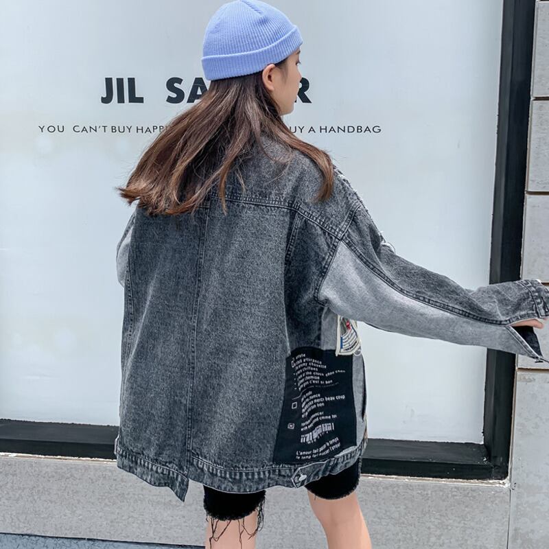 【EWQ】フルスリーブアップリケ柄オーバーサイズブラックヨーロピアンデニムジャケットステッチプリント文字オーバーコート