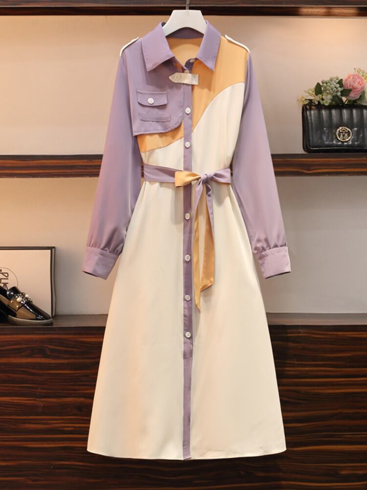 [EWQ] 甘い長袖スプライシング ベルト シャツ ドレス春秋シックパッチワーク A ライン Vestido 16Y6034 ロング 大人ガーリー スウィート キュート カジュアル スプリング 春物 オータム 秋物 ハーネス Aライン