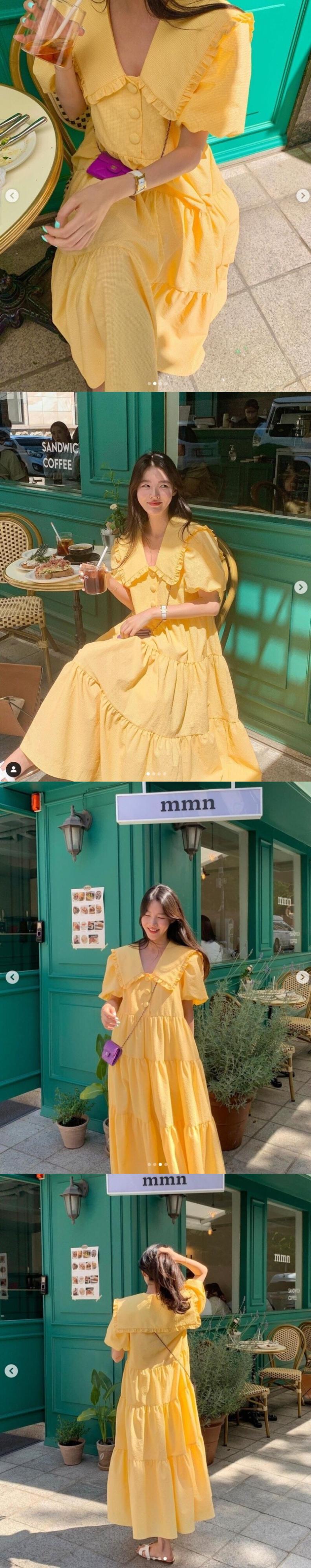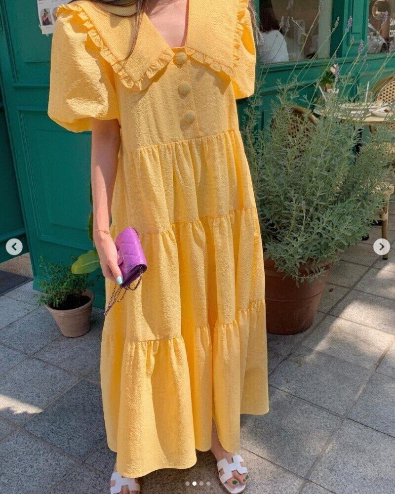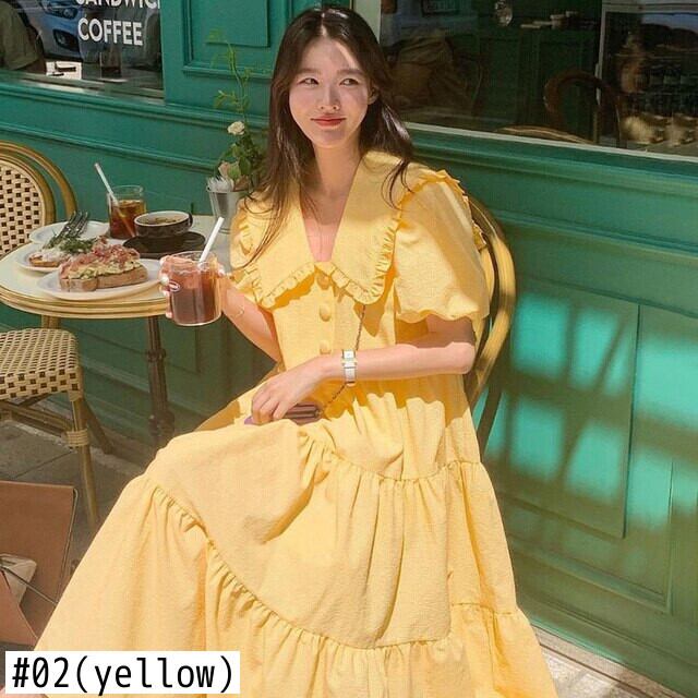 [EWQ] ラペル フリル プリーツ スプライス ドレス黄色半袖シックボタン ドレス春夏 Vestido 130 ショート ハーフスリーブ スプリング 春物 サマー 夏物