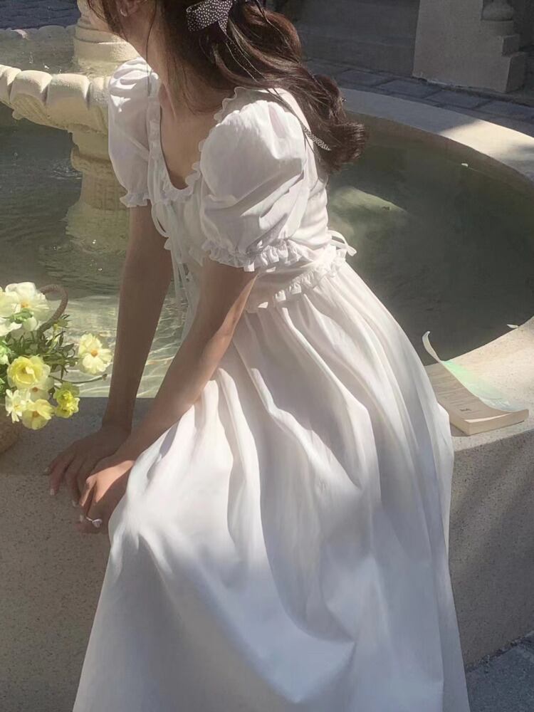[EWQ] U ネック フリル スプライス レースアップ ドレス パフ スリーブ プリーツ ウエスト無地ドレス夏潮乗り サマー 夏物 ソリッドカラー