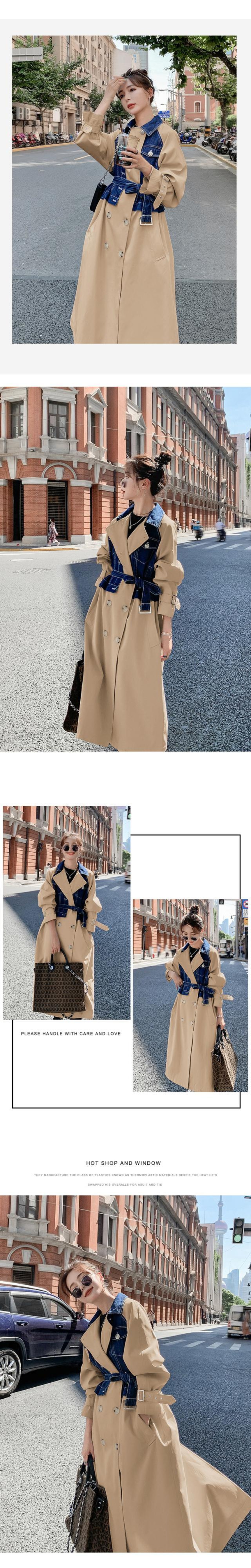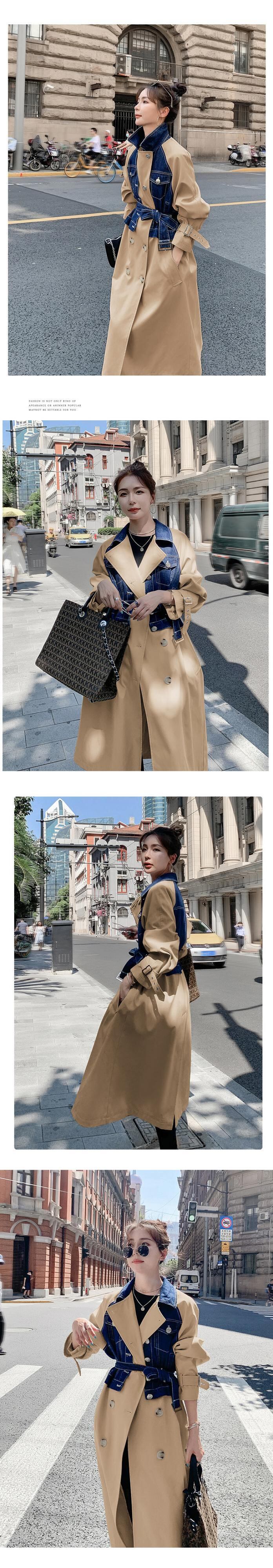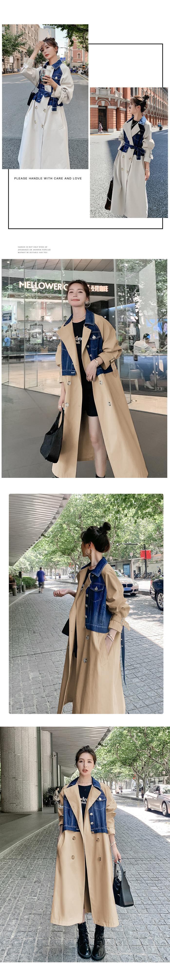 【EWQ】デニム パッチワーク ウインドブレーカー スプライシング トレンド オーバーコート 春 長袖 トレンチコート カーキ アウター ロング スプリング 春物