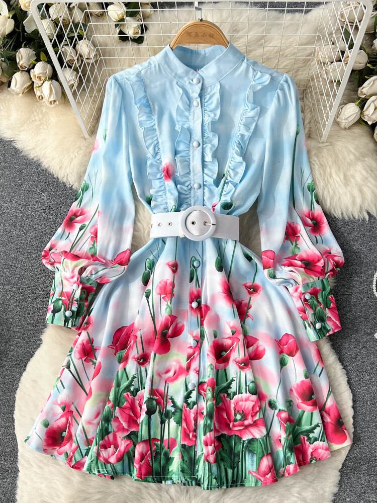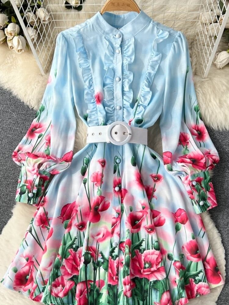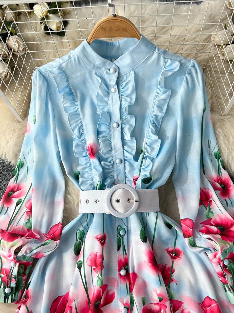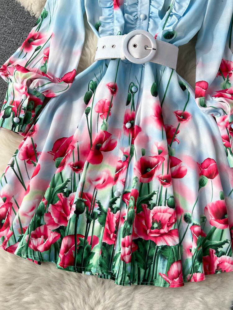 [EWQ] 甘いプリント フラワー ウエスト ドレス シングル ブレスト プリント プリーツ レースアップ Vestido 春夏 16Y6164 大人ガーリー スウィート キュート カジュアル スプリング 春物 サマー 夏物 フラワーデザイン