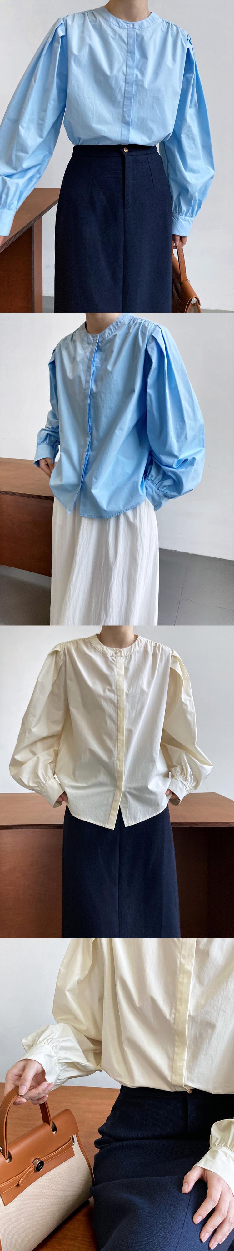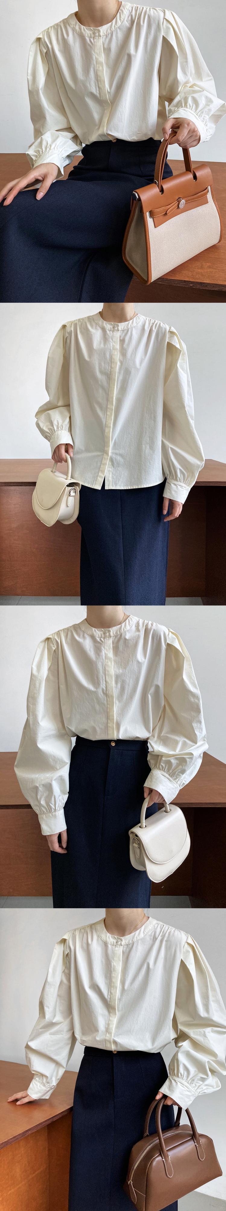 [EWQ] ランタンスリーブ無地シャツ春秋シングルブレストブラウスルーズ O ネックトップ 6Y7183 スプリング 春物 オータム 秋物 Oネック ソリッドカラー