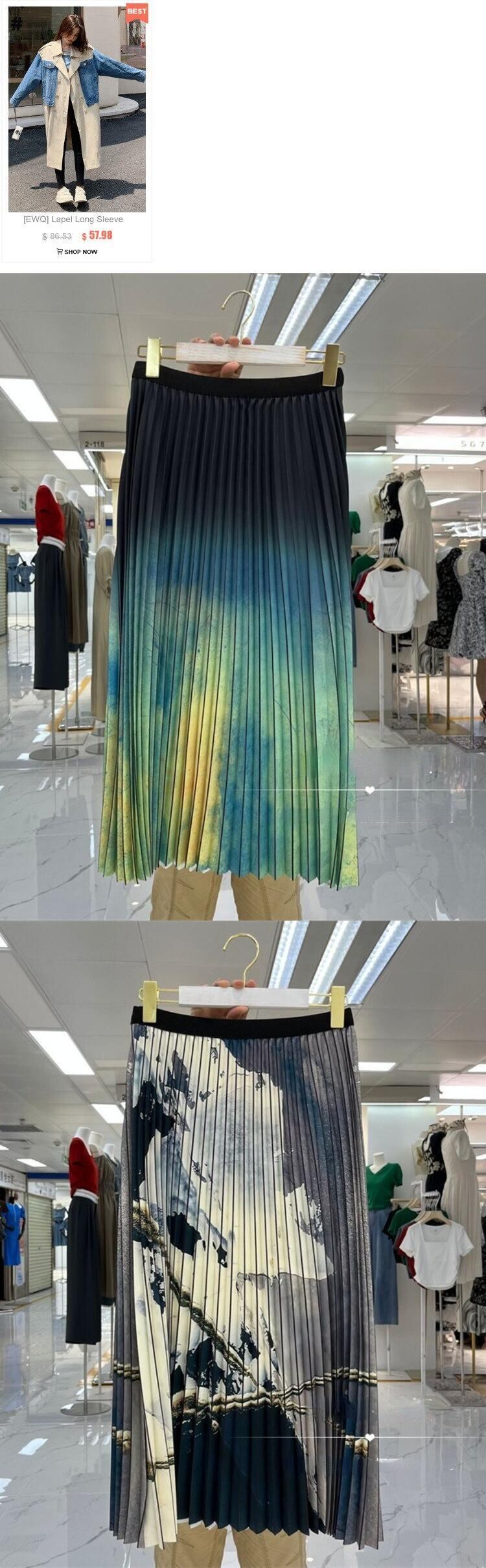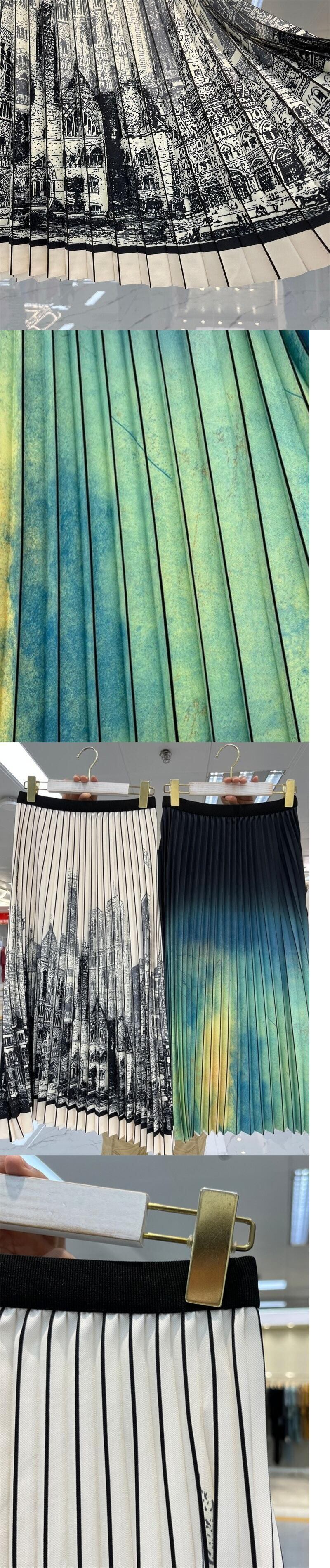 [EWQ] 油絵花シック色コントラストスカート春夏潮 A ライン プリーツ ミッドカーフ スカート 16Y5 スプリング 春物 サマー 夏物 Aライン フラワーデザイン
