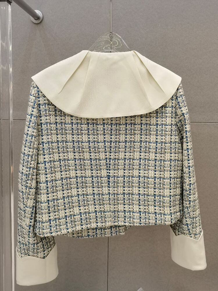 [EWQ] レディース チェック コントラスト カラー ショート ツイード ジャケット フリル スプライス シングル ブレスト ロング スリーブ コート トップス 春 秋 長袖 スプリング 春物 オータム 秋物