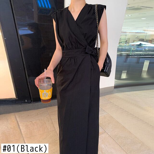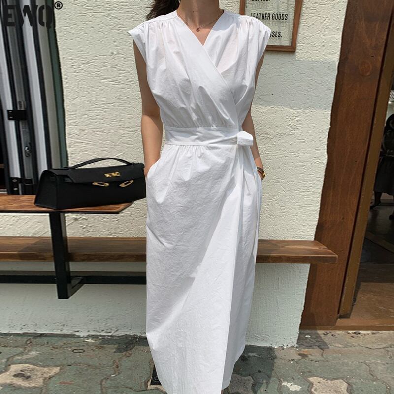 [EWQ] シック V ネック レース無地プリーツ ルーズ ホワイト ノースリーブ ミディ ドレス夏 16E691 サマー 夏物 Vネック ソリッドカラー