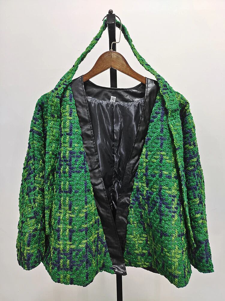 [EWQ] ニット パッチワーク トップ ツイード ジャケット冬春コート長袖 Pu レザー V ネック グリーン アウター 16Y3430 ロング スプリング 春物 ウィンター 冬物 Vネック