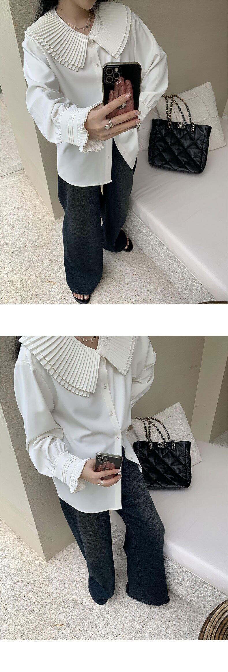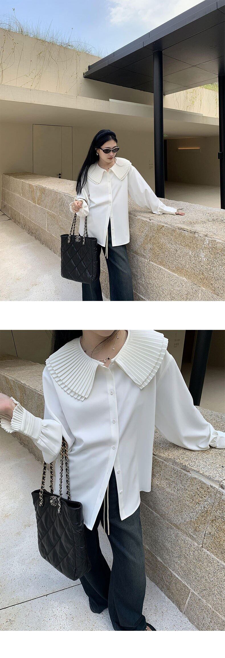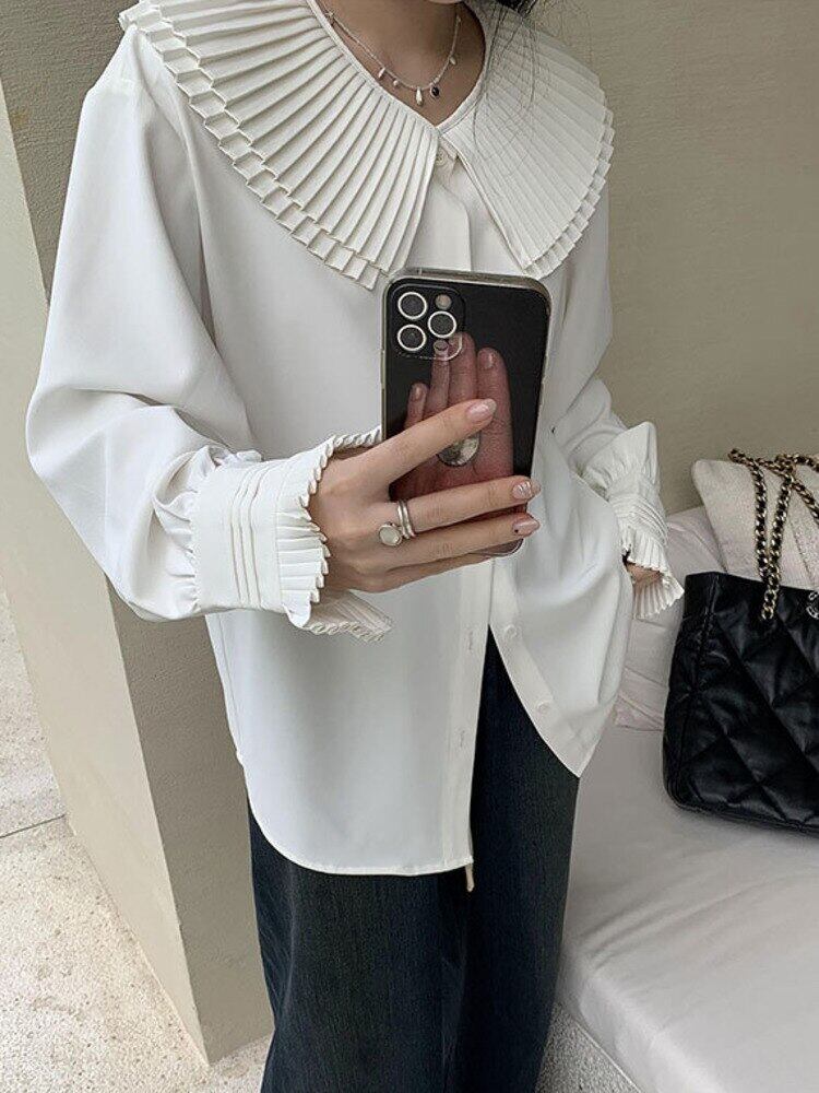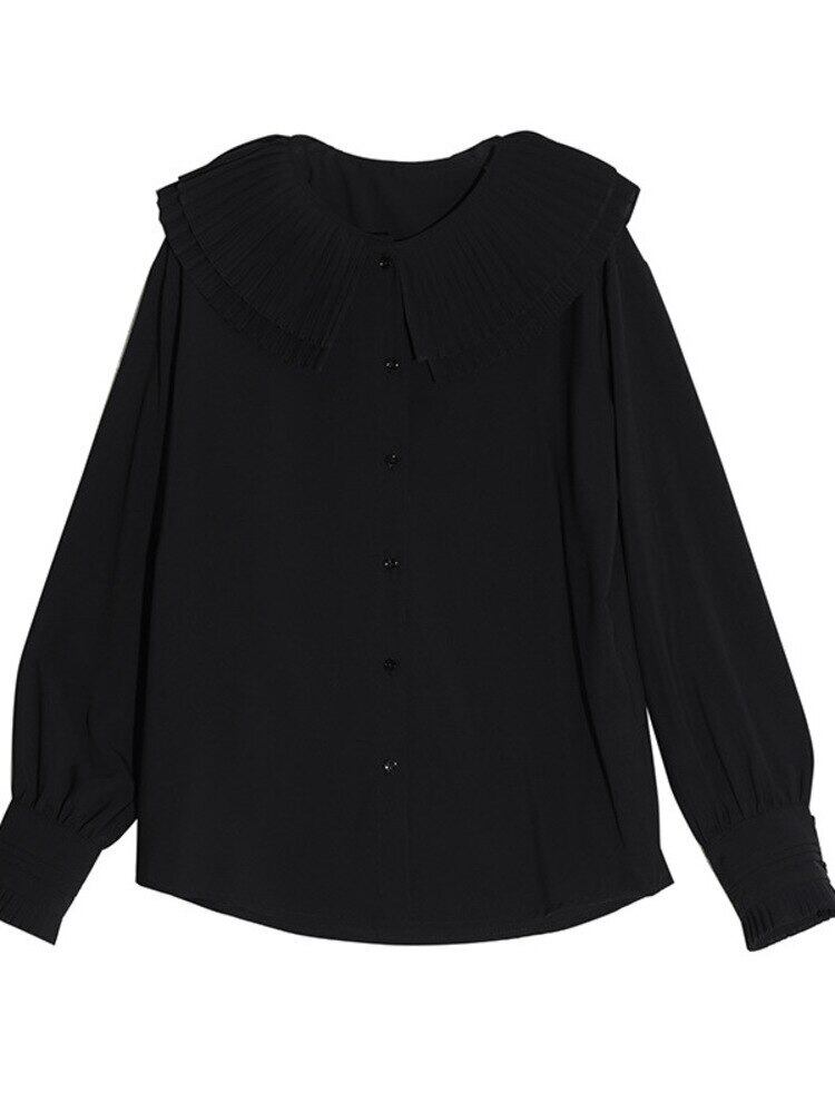 [EWQ] 無地プリーツ襟シャツ フリル スプライシング長袖ブラウス トップ春秋トップス ロング スプリング 春物 オータム 秋物 ソリッドカラー