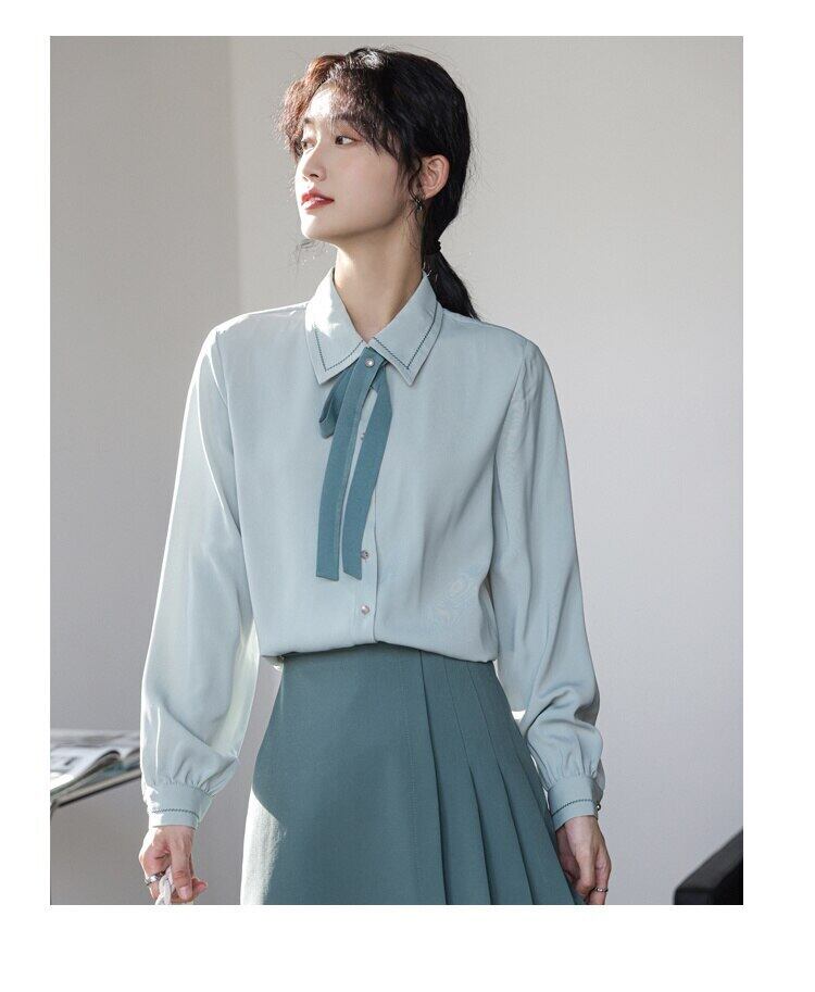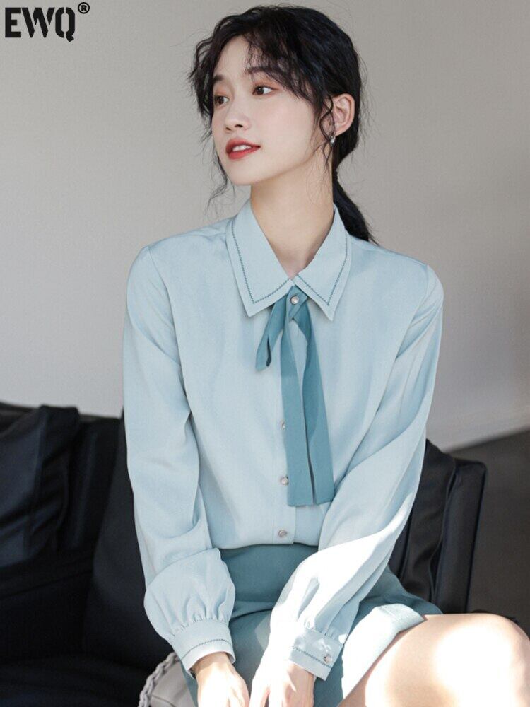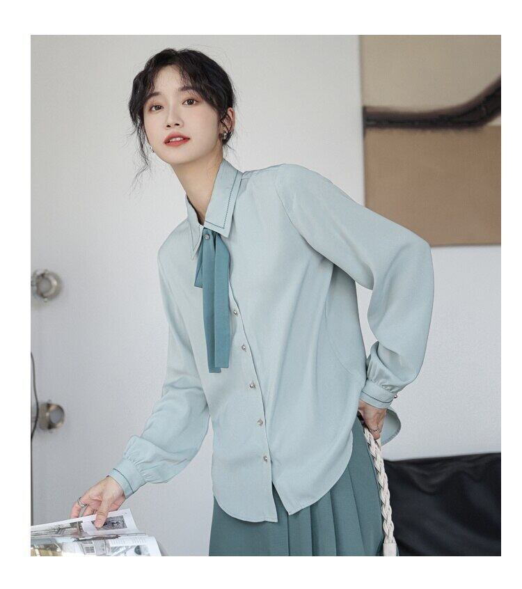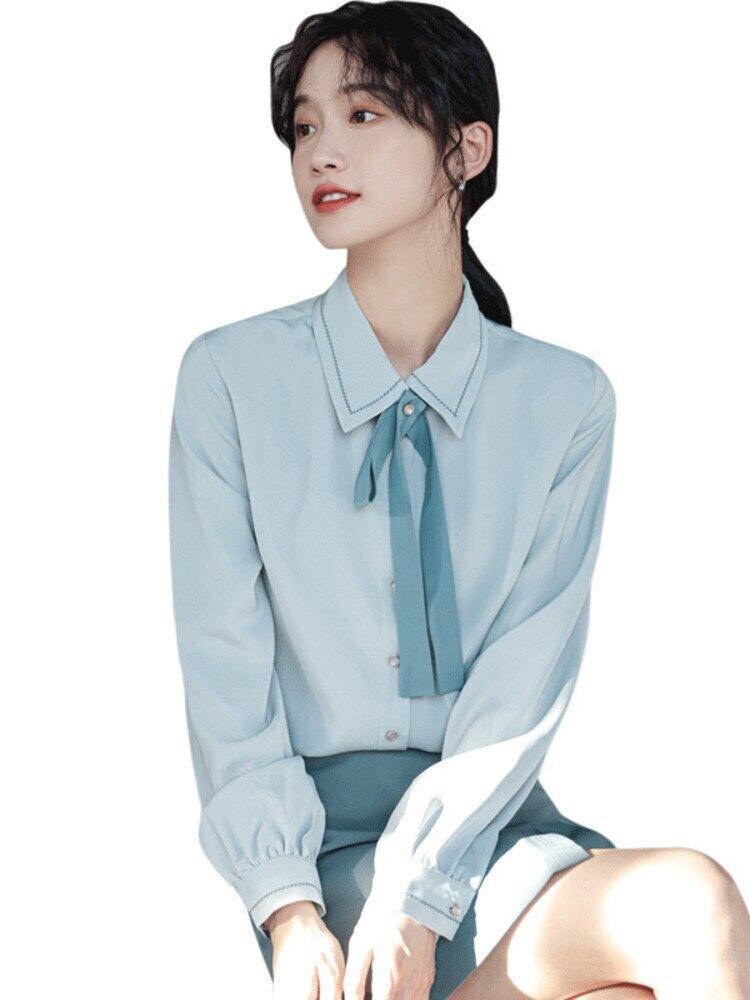 [EWQ] ボウタイ長袖シャツ春秋無地シングルブレストブラウストップス 16Y6 ロング リボン スプリング 春物 オータム 秋物 ソリッドカラー