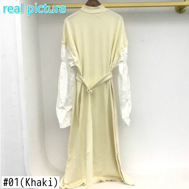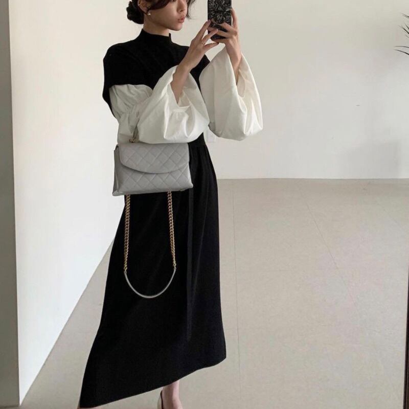 [EWQ] 秋スタンドカラー黒と白スプライシング ランタン スリーブ レースアップ ウエスト フェイク ツーピース ニット ドレス 16F0885 ホワイト ブラック ランタンスリーブ オータム 秋物