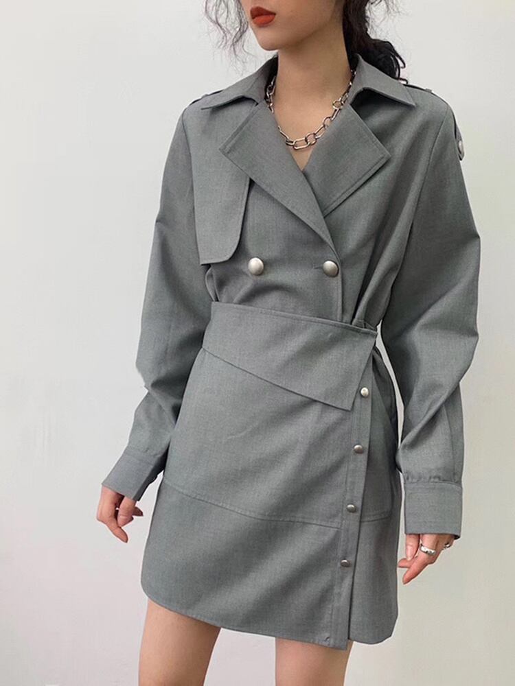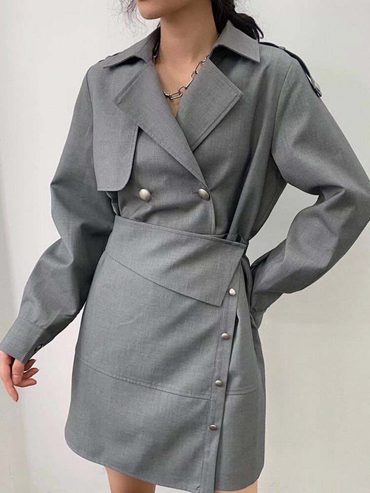 [EWQ] ラペル 長袖 ルーズ フィット 潮 春 秋 グレー ボタン イレギュラー スプリット ジョイント ドレス 美しい ロング スプリング 春物 オータム 秋物