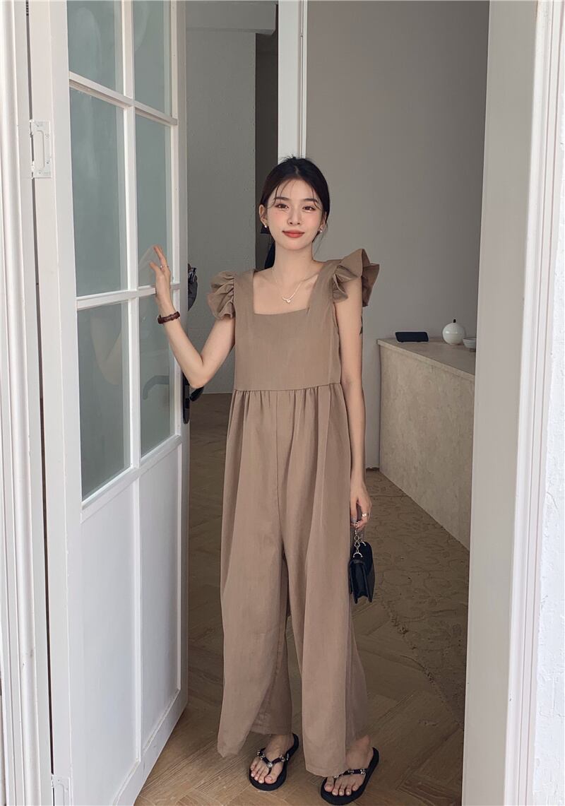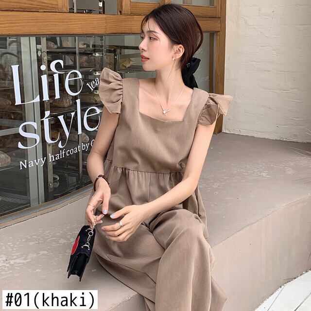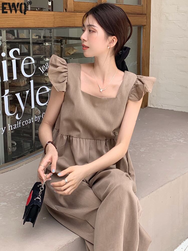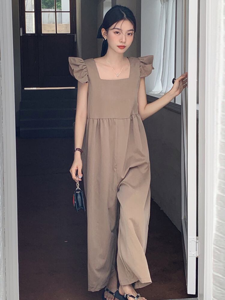 [EWQ] シンプルスクエアネックジャンプスーツフライングスリーブプリーツウエストルーズワイドレッグジャンプスーツ夏潮服 6Y8290 サマー 夏物 ワイドパンツ スクウェア