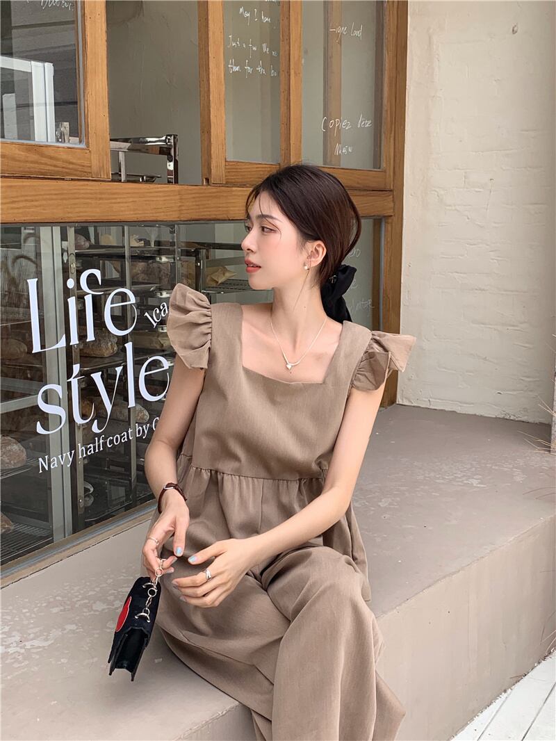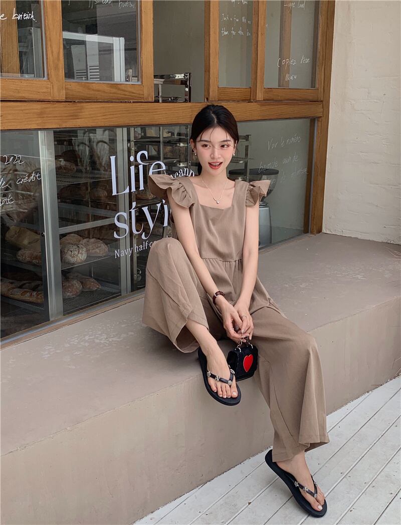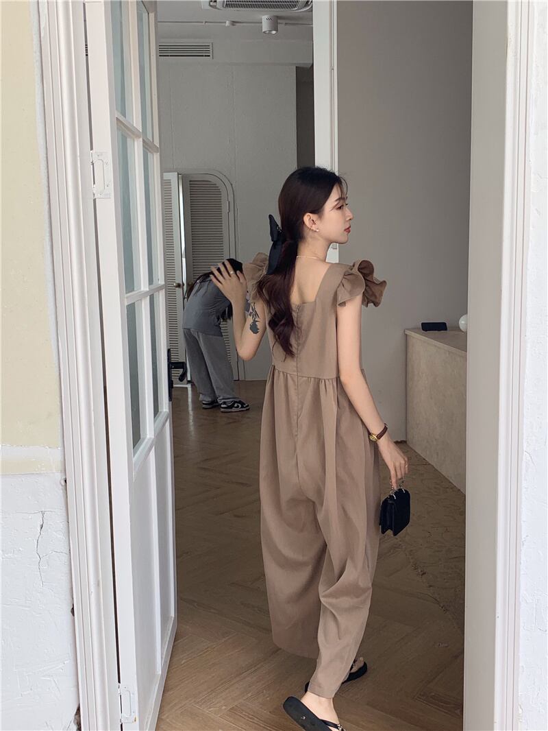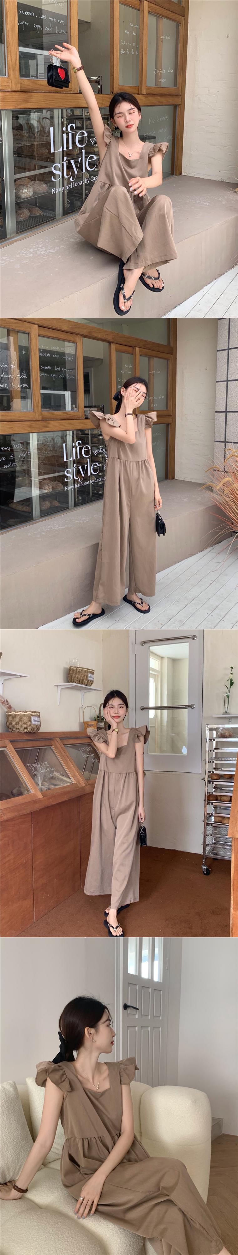 [EWQ] シンプルスクエアネックジャンプスーツフライングスリーブプリーツウエストルーズワイドレッグジャンプスーツ夏潮服 6Y8290 サマー 夏物 ワイドパンツ スクウェア