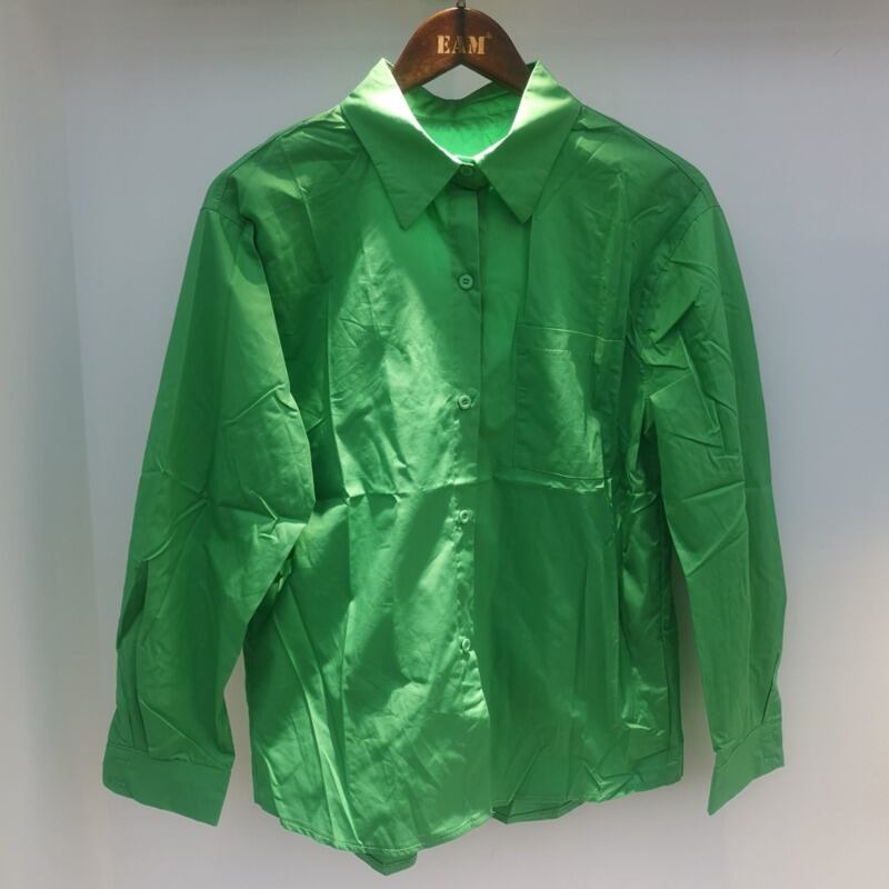 [EWQ] ターンダウンカラー ランタンスリーブ ルーズシャツ 春 レディース ブラウス シングルブレスト グリーン 16W362 スプリング 春物