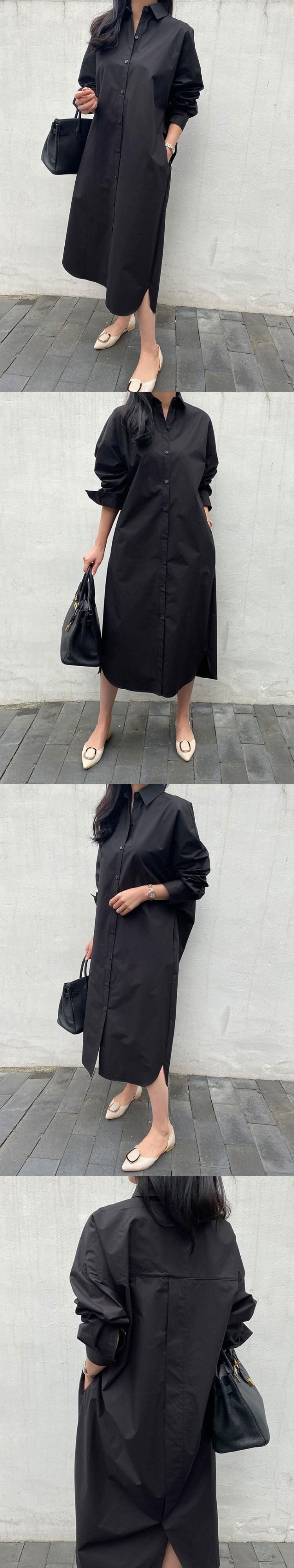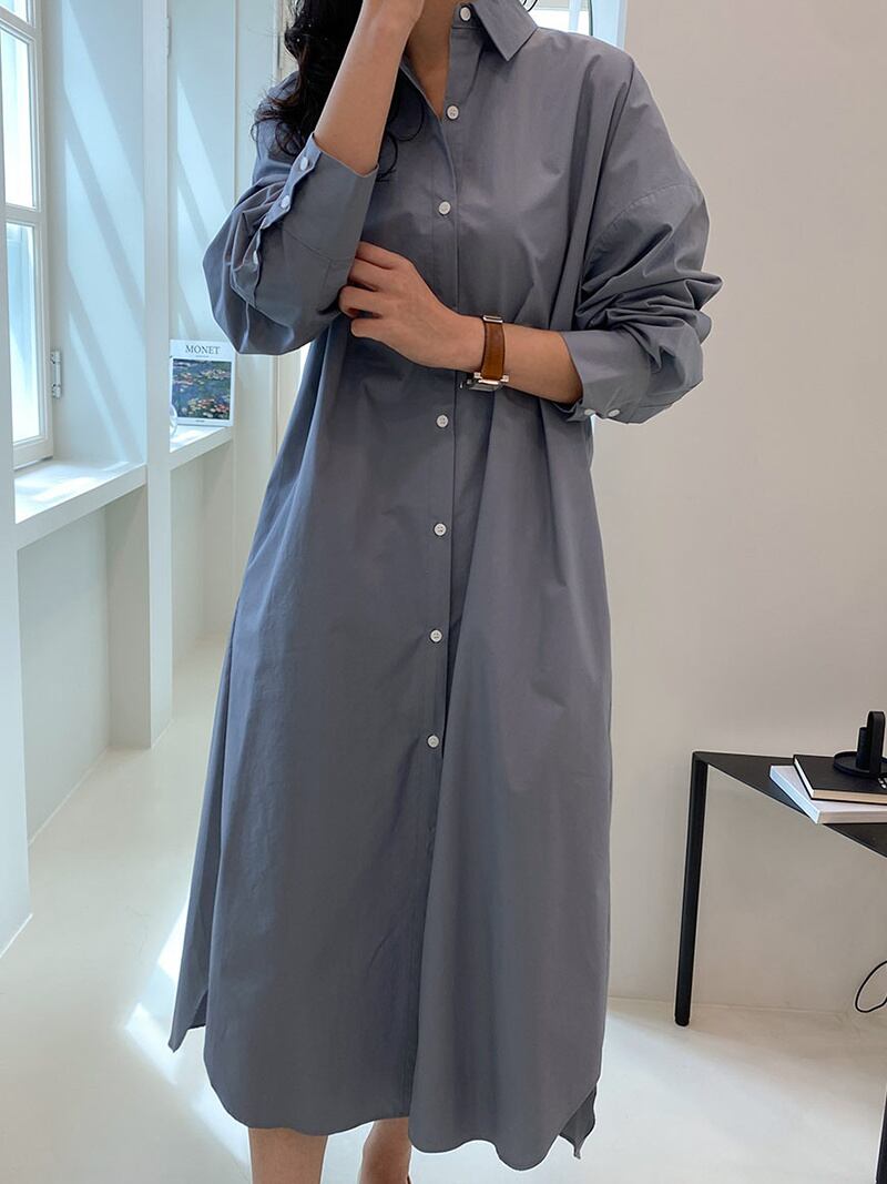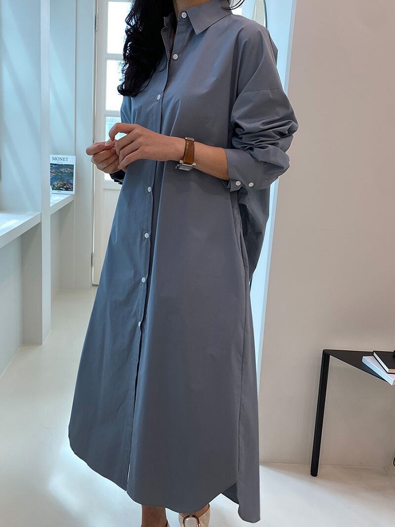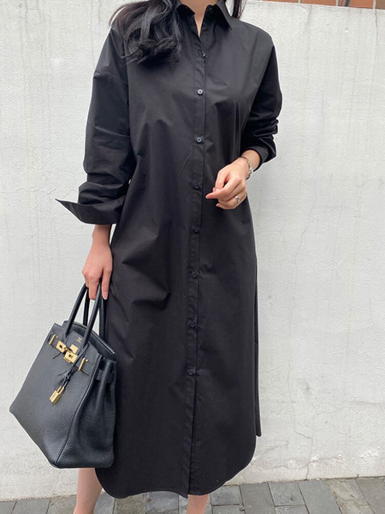 [EWQ] シングル ブレスト バック スプリット シャツ ドレスソリッド ルーズ マキシ ドレス春秋潮vestido Y6913 スプリング 春物 オータム 秋物 ソリッドカラー
