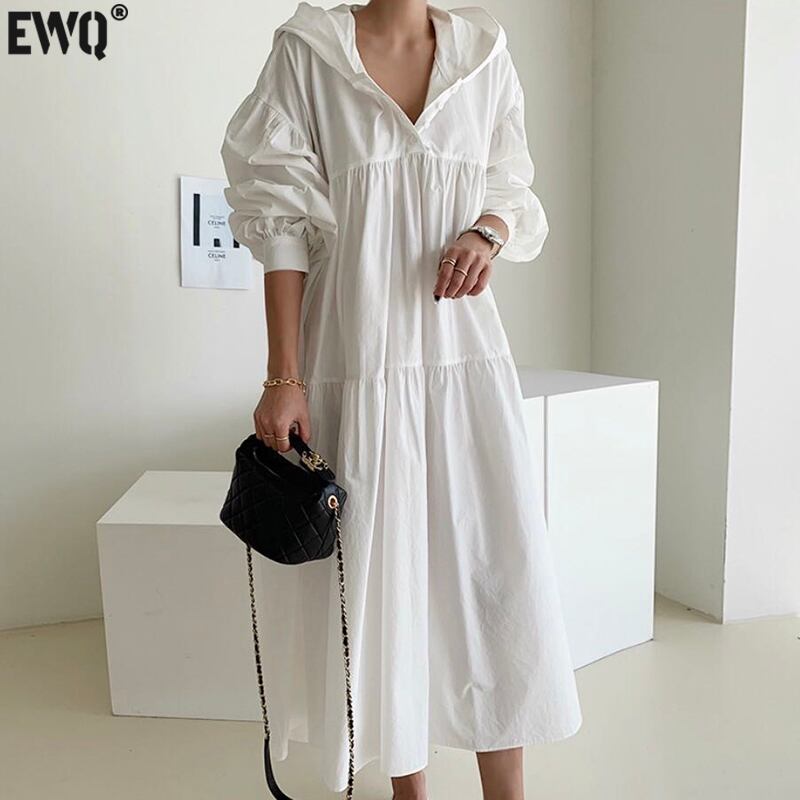 【EWQ】ミニマリズム ランタンスリーブワンピース 潮風 秋 シック フード付き ランウェイワンピース オータム 秋物 ドレス
