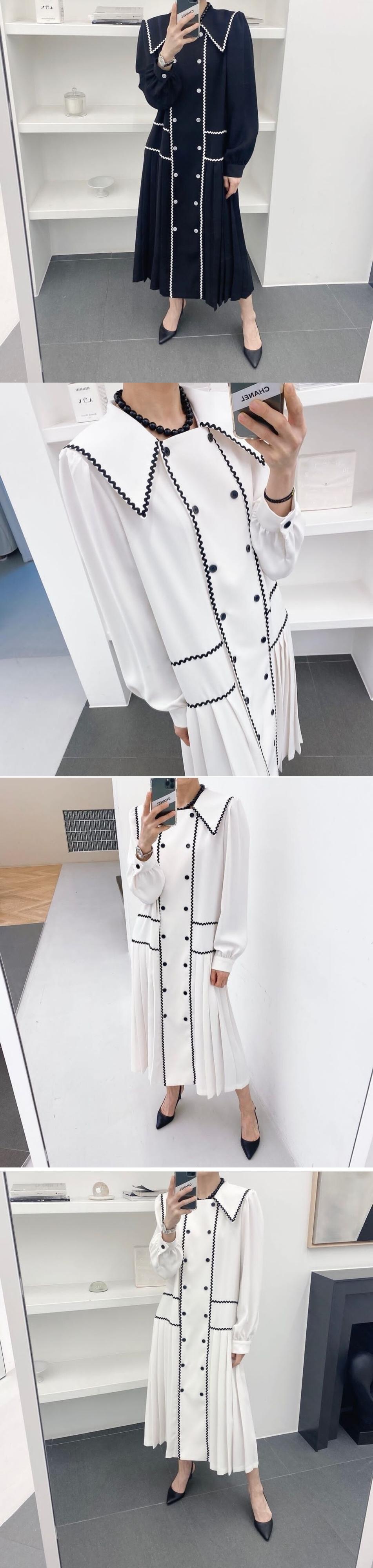 [EWQ] シックレトロラペル コントラスト レース ダブルブレスト長袖パッチワーク プリーツ ドレス秋潮 16Y26 ロング オータム 秋物
