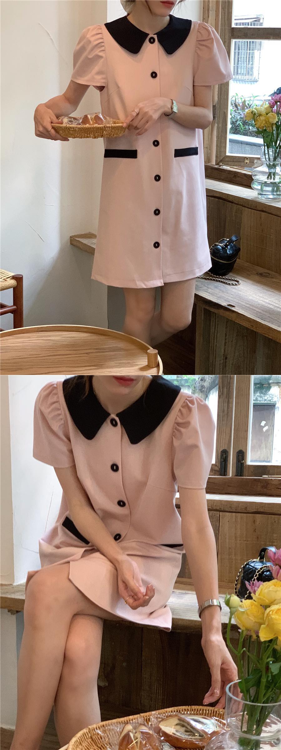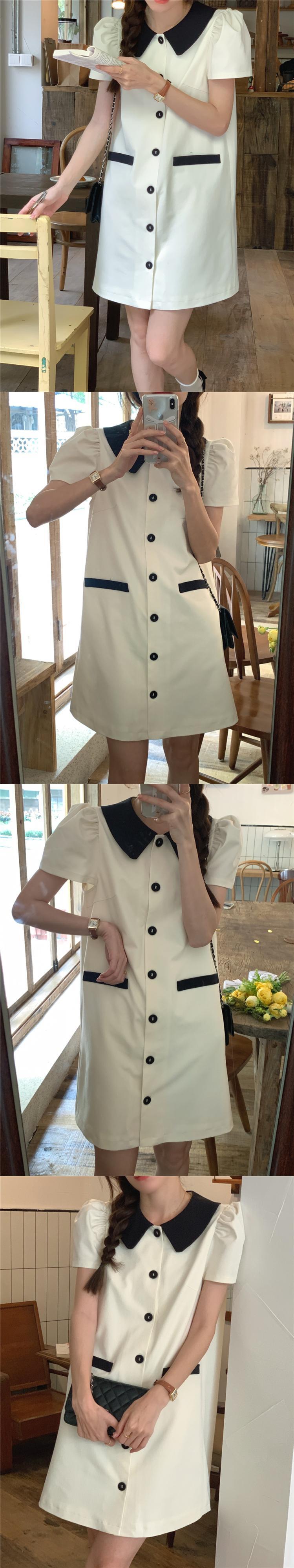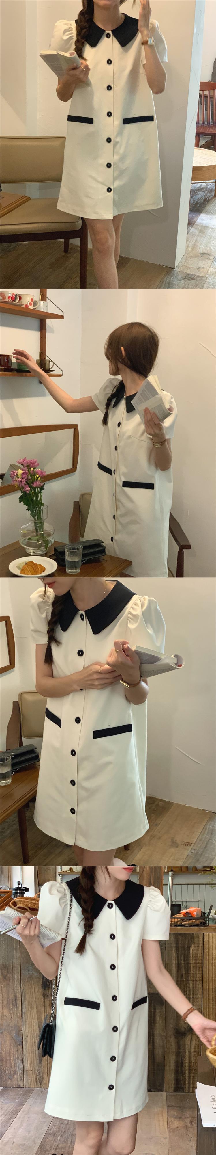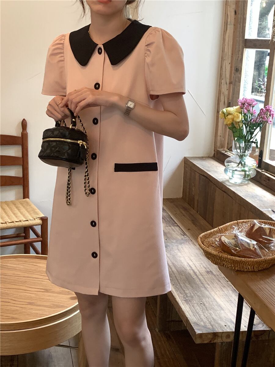 [EWQ] コントラストカラーラペルシングルブレストドレスルーズバブルスリーブパッチワークミニドレスサマータイド Vestido 夏物