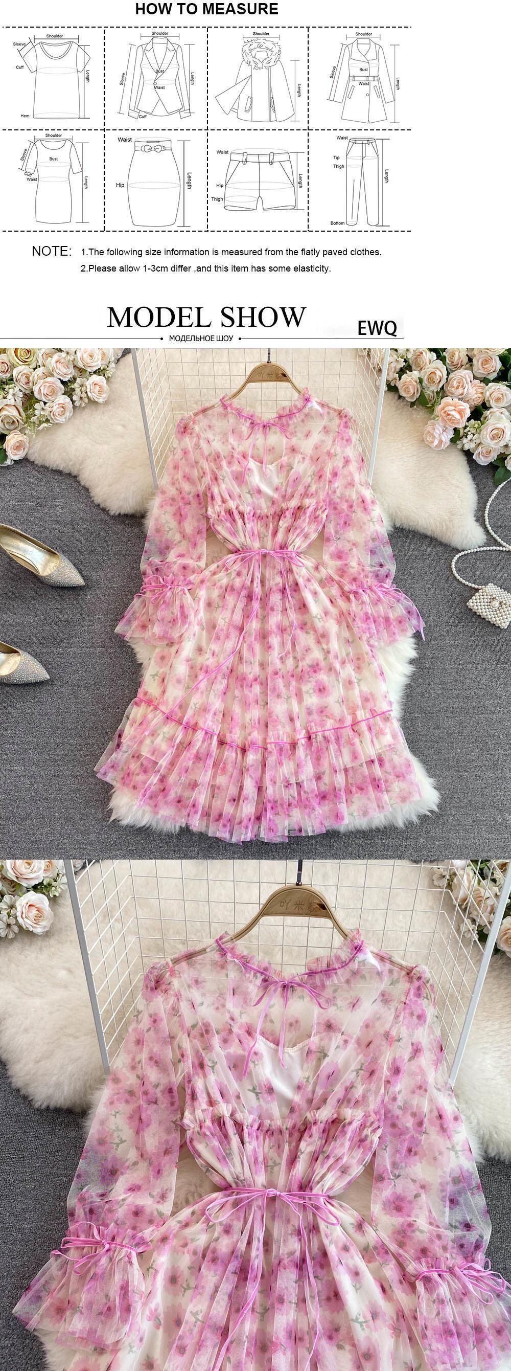 【EWQ】高級Oネックフレアスリーブメッシュプリントワンピース レディース レースアップ コントラストカラーワンピース サマータイドパーティー Vestido 7896 夏物 ドレス