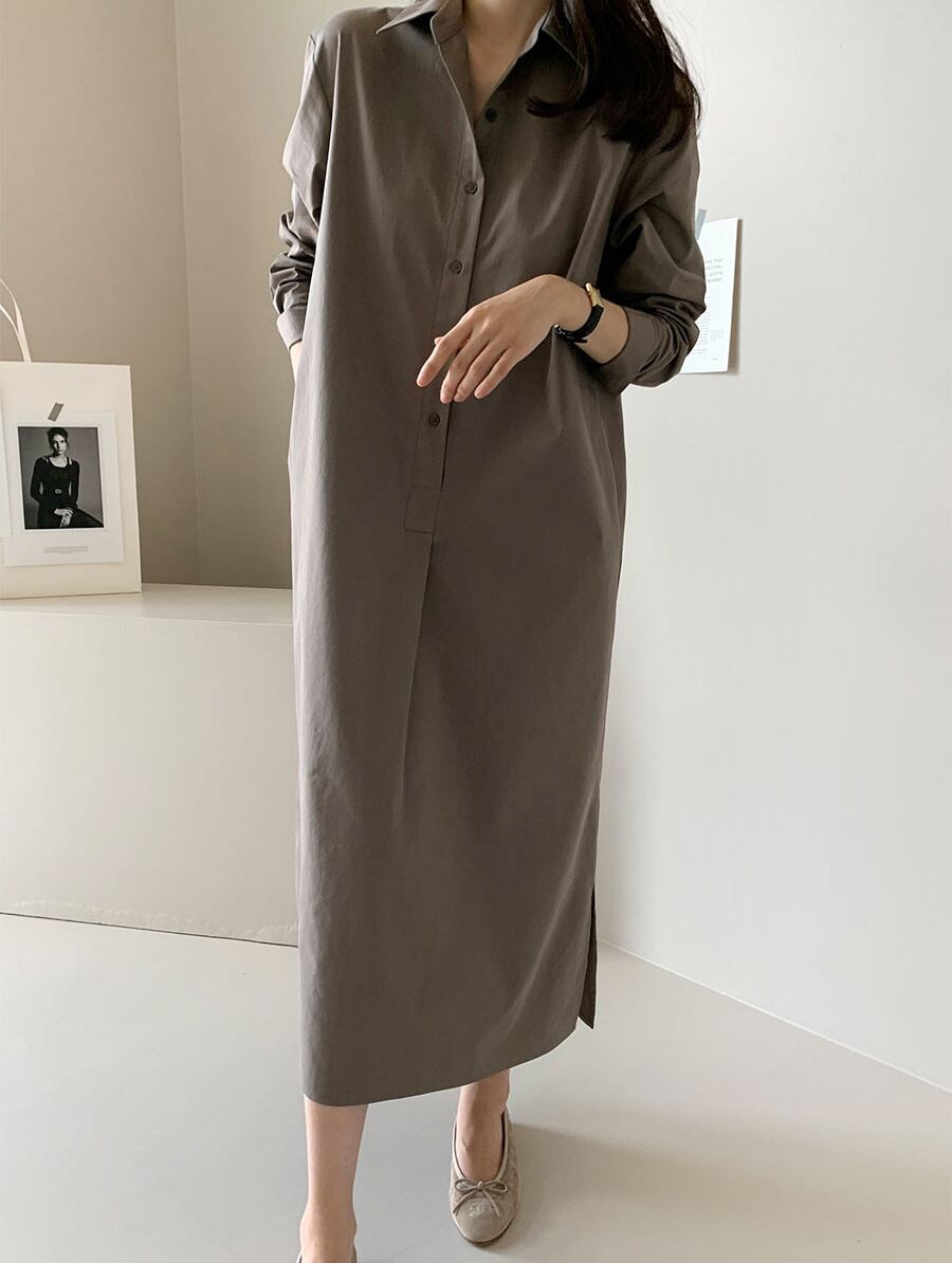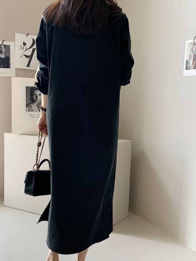 [EWQ] シングルブレストシャツドレス長袖無地ミニマリストマキシドレス春秋 Vestido 31 ロング スプリング 春物 オータム 秋物 ソリッドカラー
