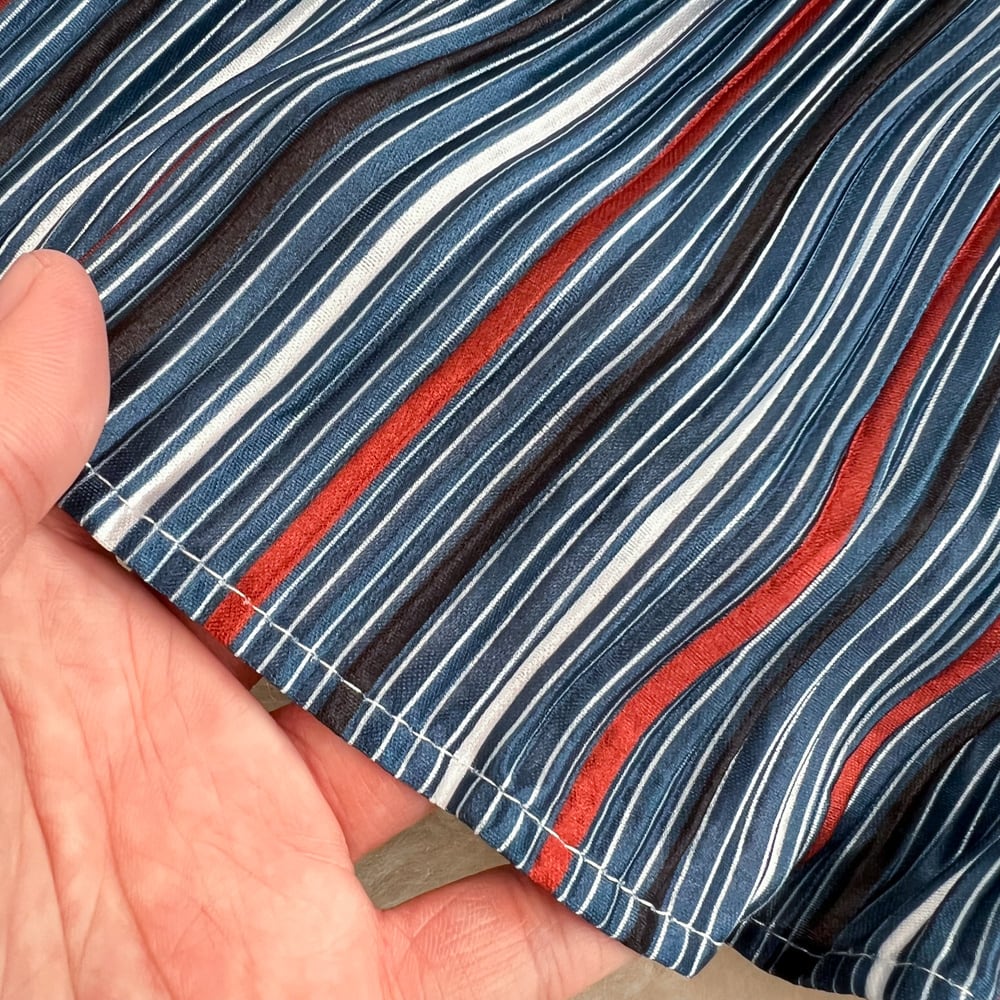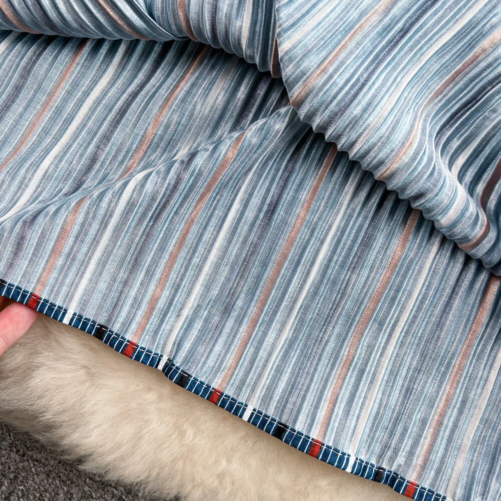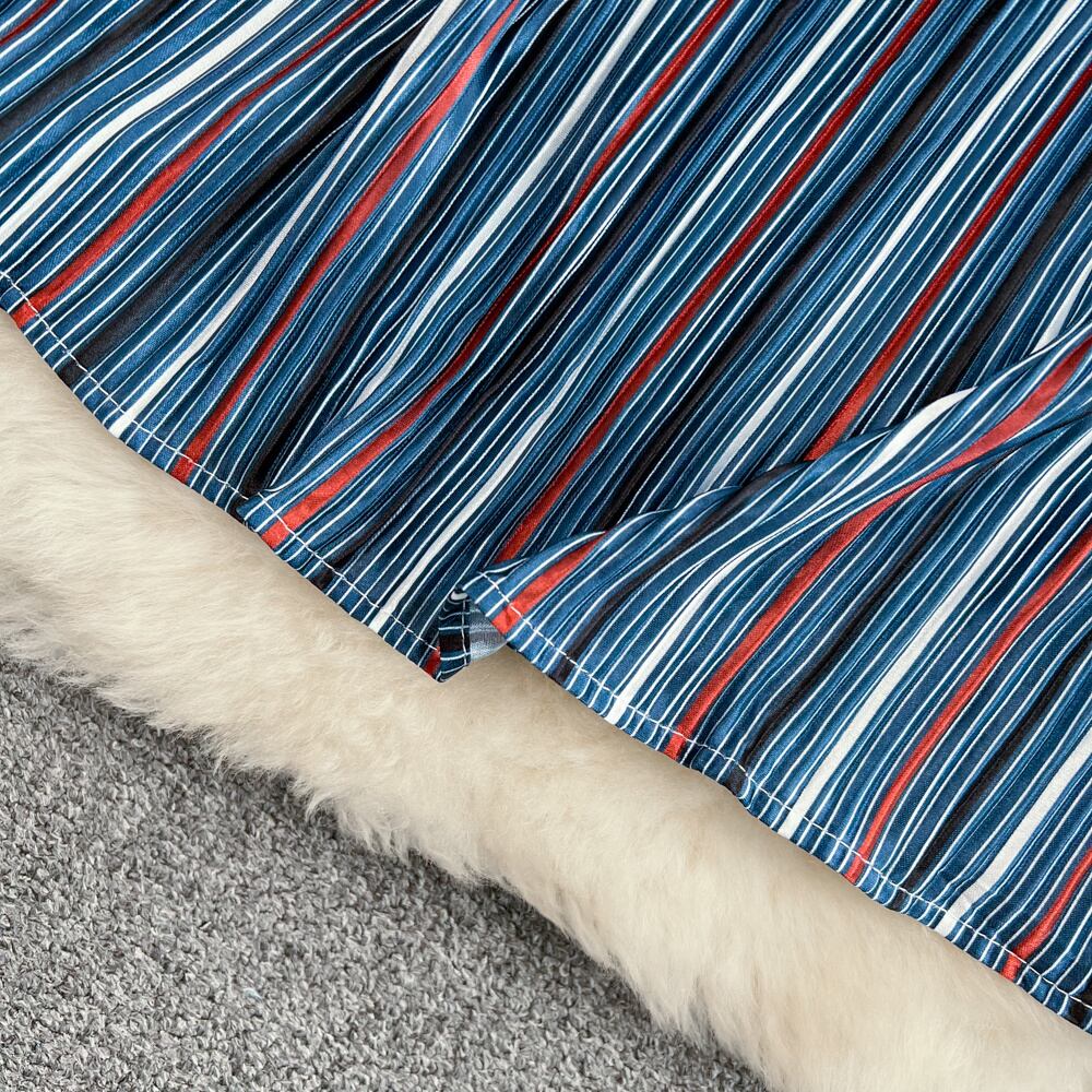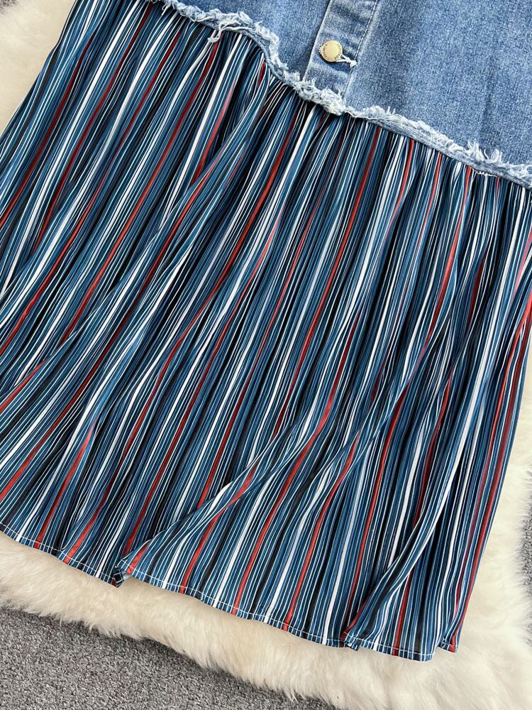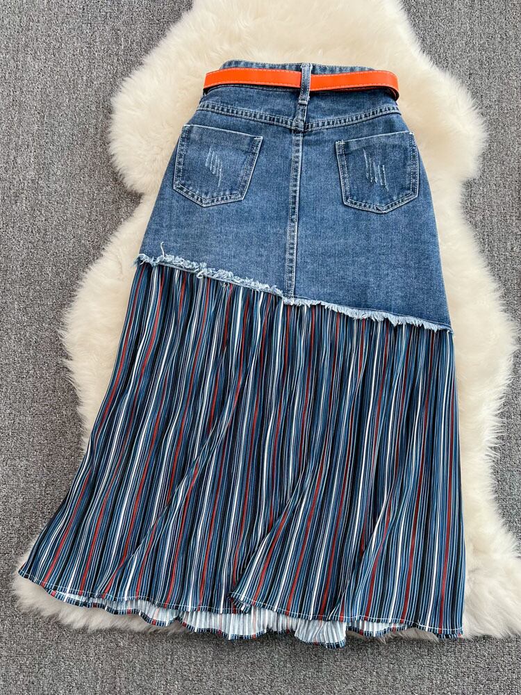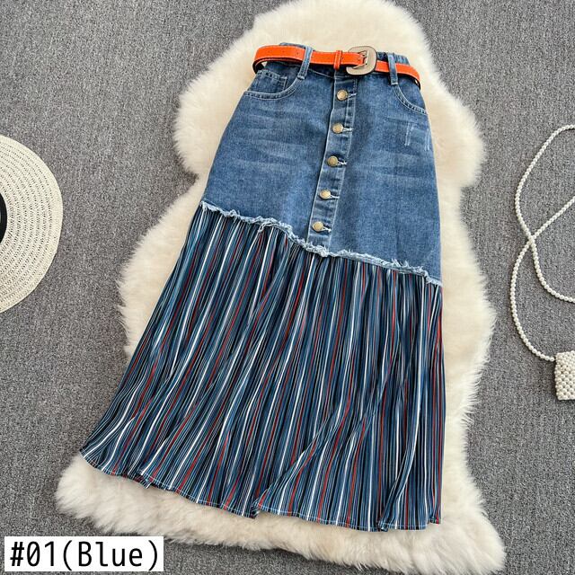【EWQ】 ストライプ プリント デニム スプライス t ウエスト イレギュラー ミッドカーフ Aライン スカート ベルト付き 春物 レディース 16W2302 スプリング ハーネス