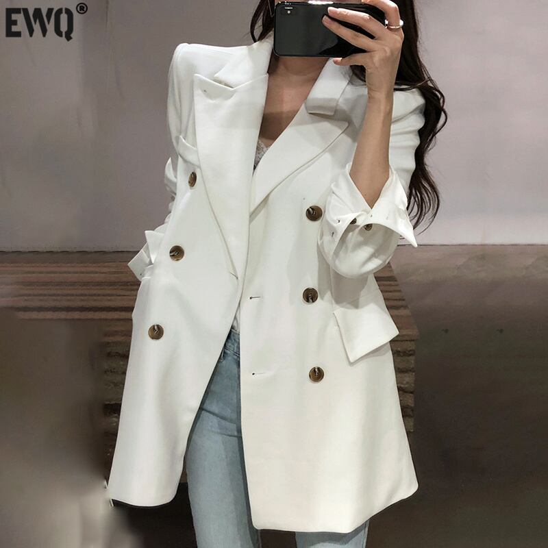 【EWQ】ノッチカラー長袖ブレザー トレンドダブルブレスト ゆったり白コート 春 ロング ホワイト スプリング 春物