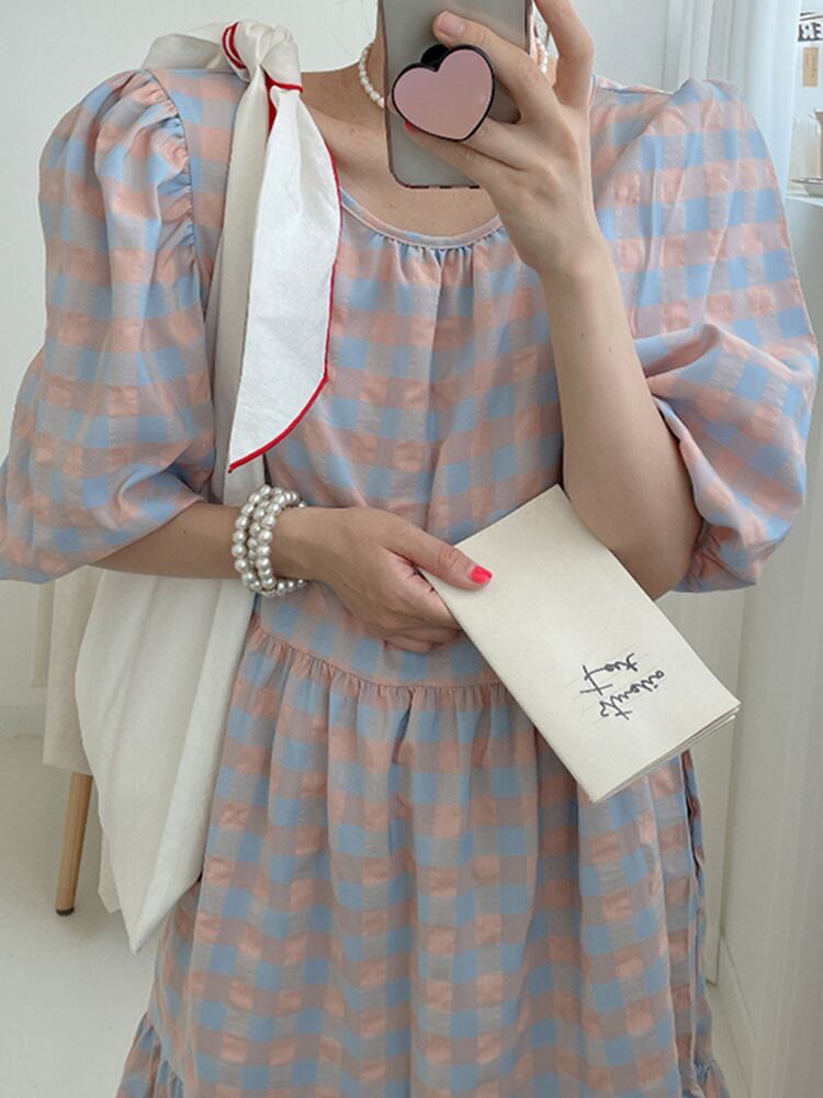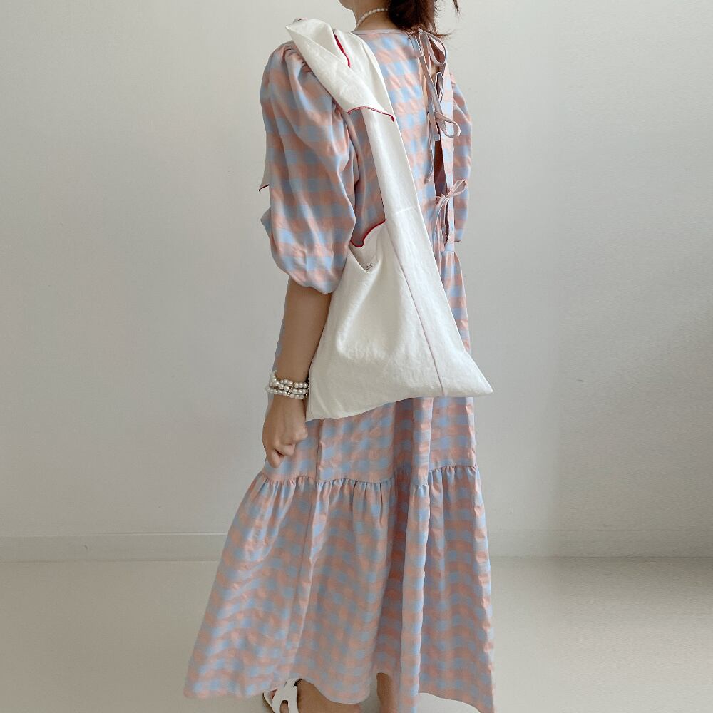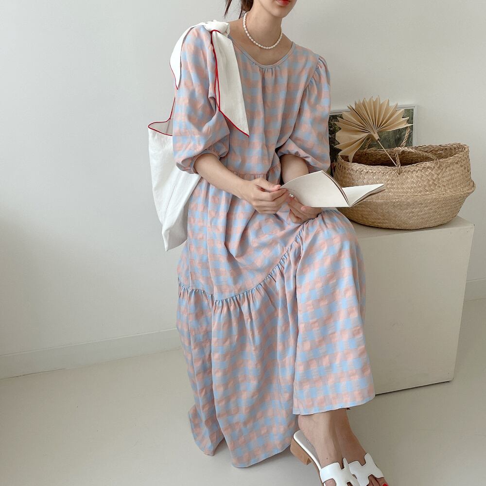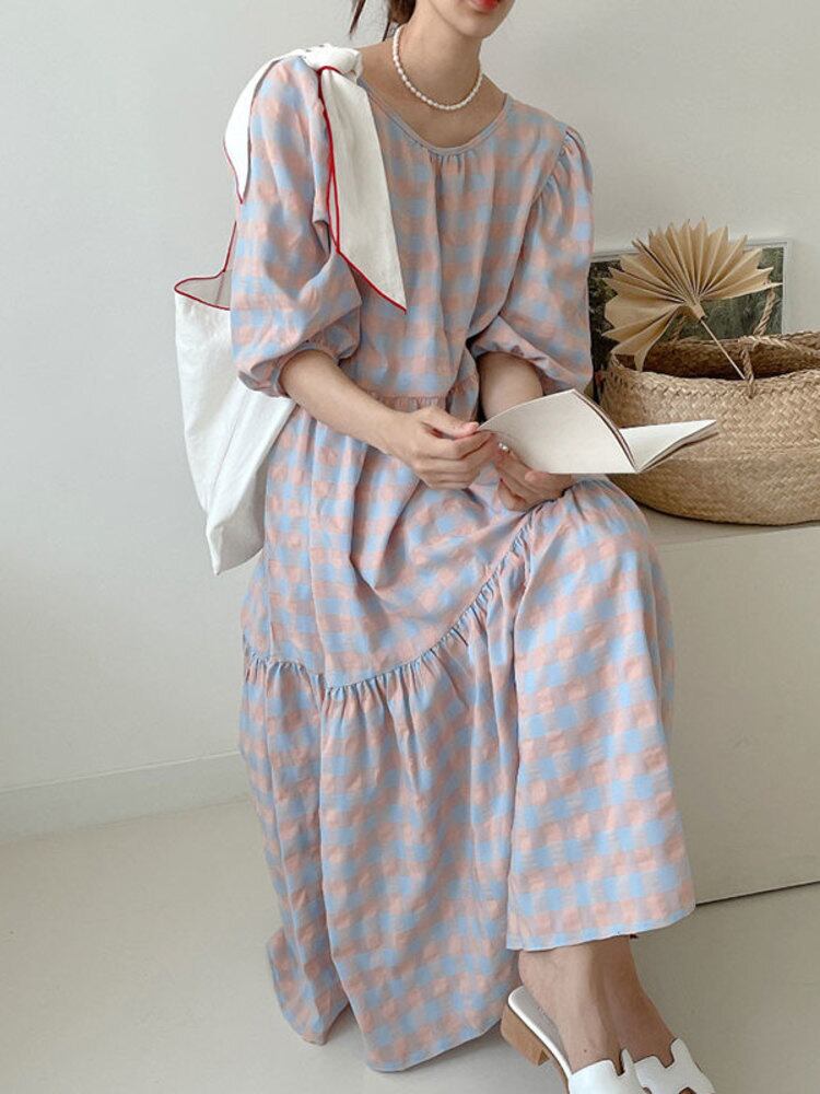 [EWQ] コントラストチェックバックレースアップフリルドレス半袖ソフトマキシドレス春夏潮 Vestido 6873 ショート ハーフスリーブ スプリング 春物 サマー 夏物