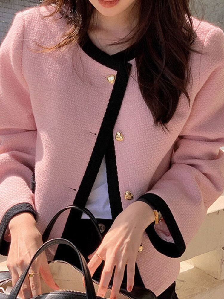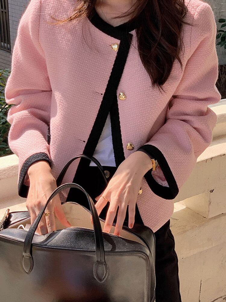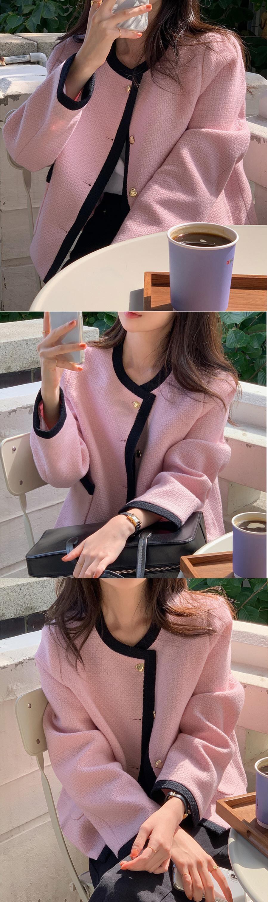 [EWQ] シックシングルルーズピンクジャケット春秋ツイードコート黒アウターオーバーコート ブラック スプリング 春物 オータム 秋物
