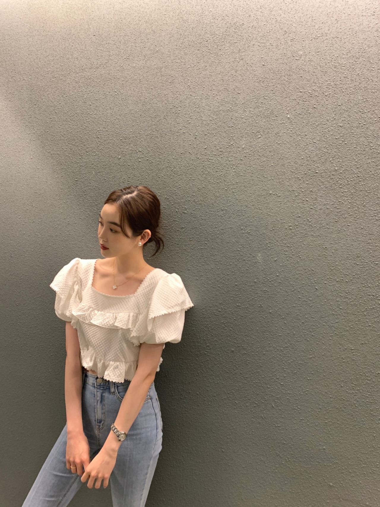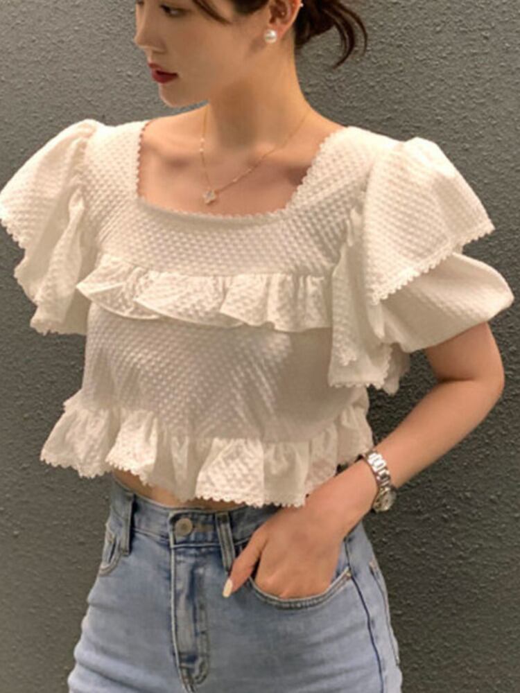 [EWQ] レーススプライシングスクエアネックシャツパフスリーブフリルトップ春夏シャツトップス 16Y6635 スプリング 春物 サマー 夏物 スクウェア