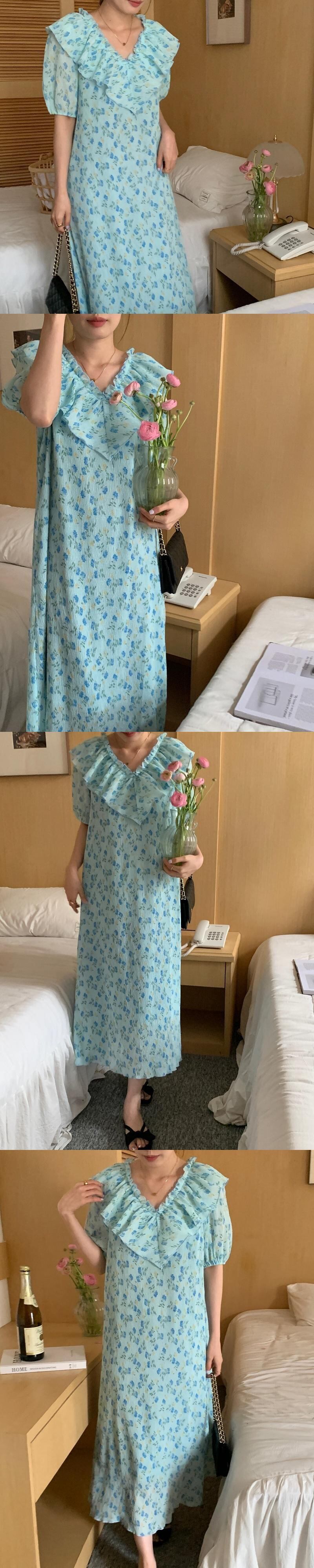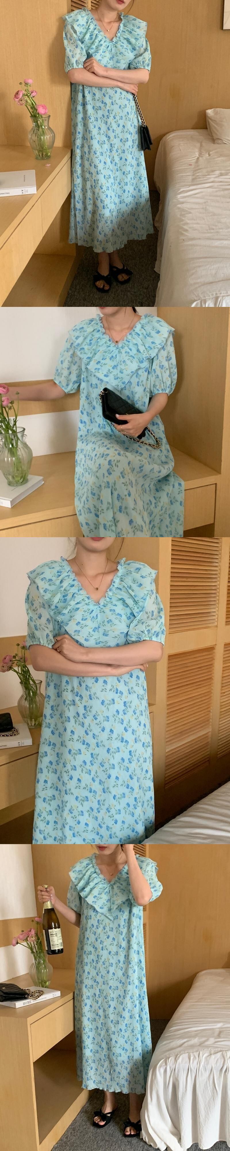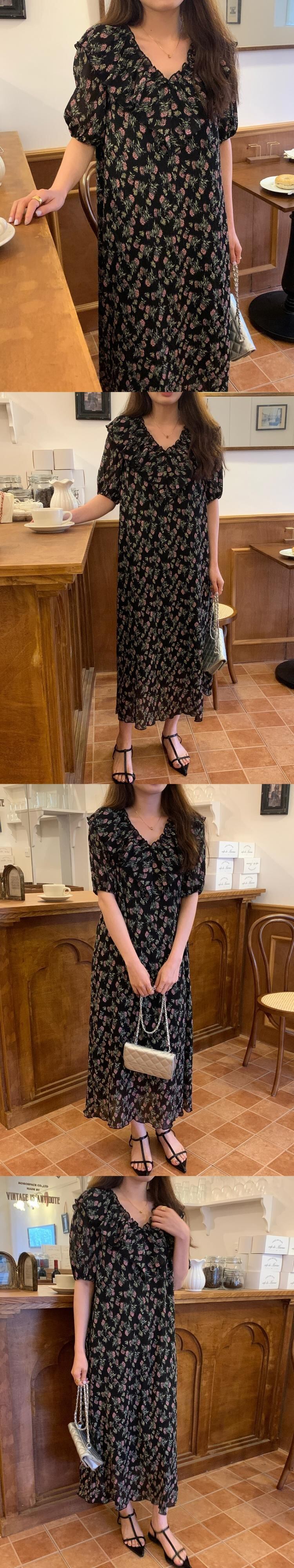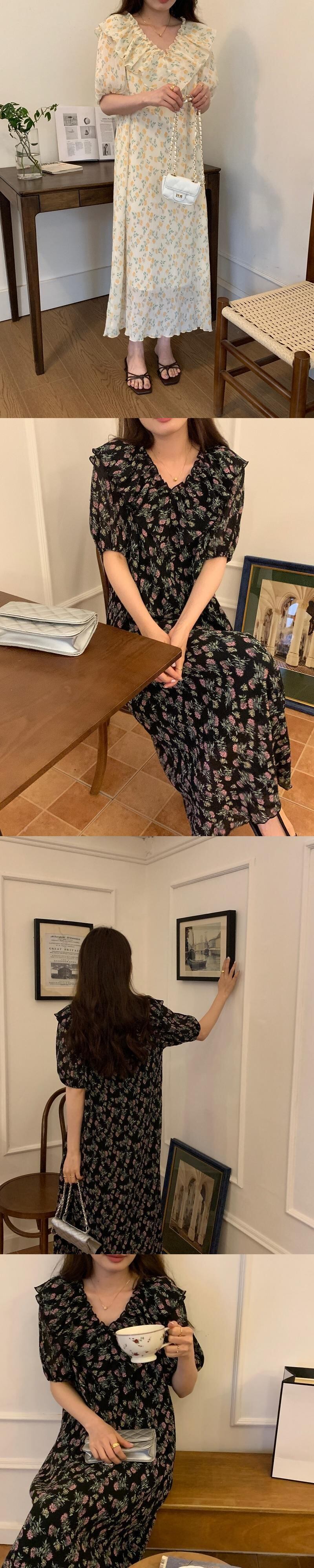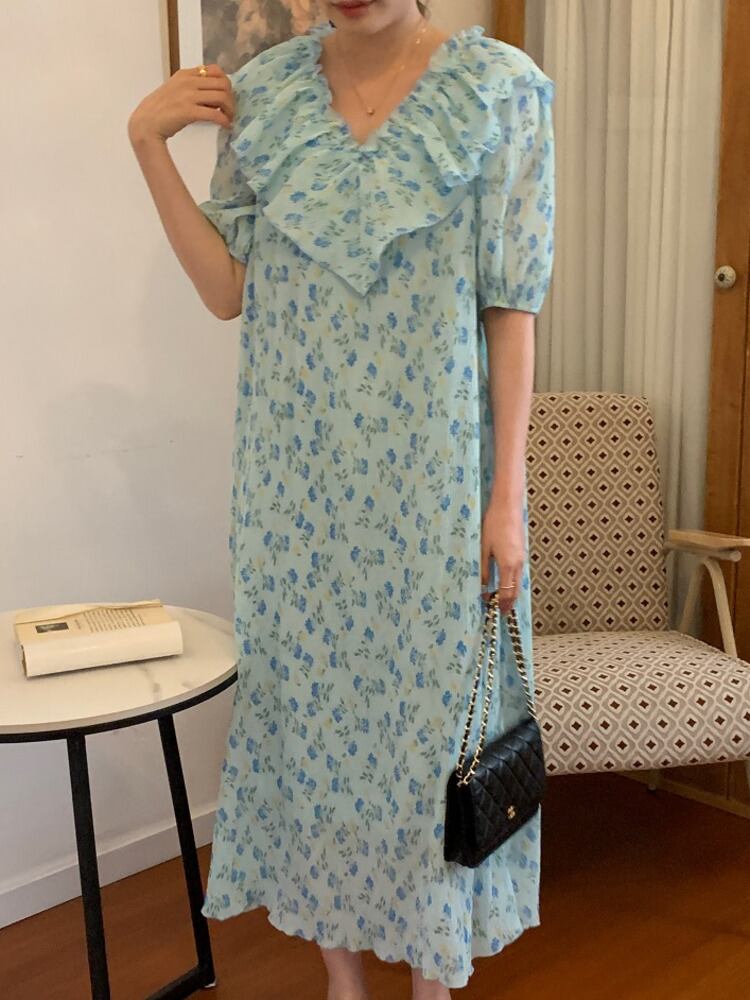 [EWQ] フリルスプライスラプルプリントドレスコントラストカラーフローラルパフスリーブドレスサマータイド Vestido 8407 夏物 花柄