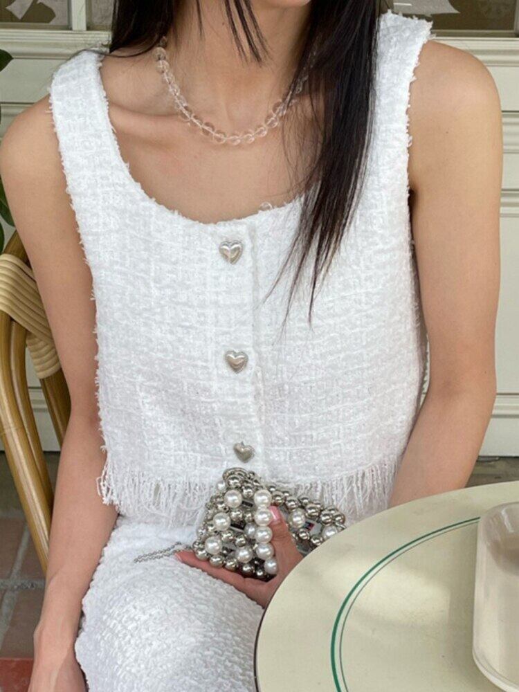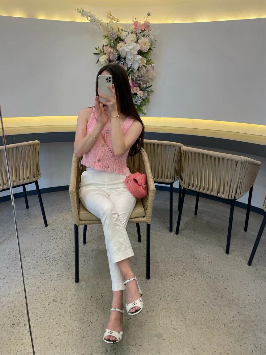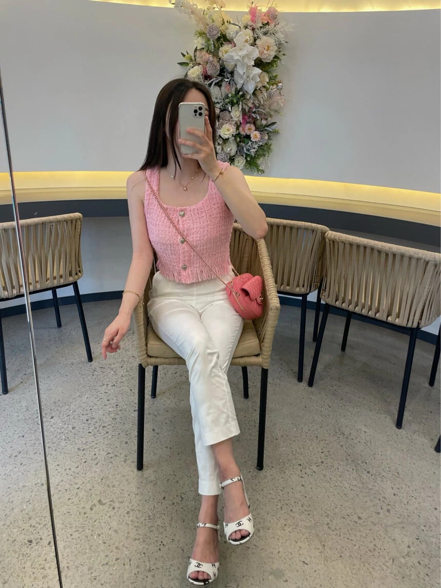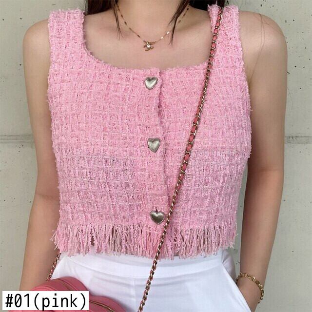 [EWQ] スクエアネックメタルラブボタン電話TシャツスウィートピンクノースリーブTシャツトップサマーTシャツ7659 大人ガーリー キュート カジュアル 夏物 スクウェア
