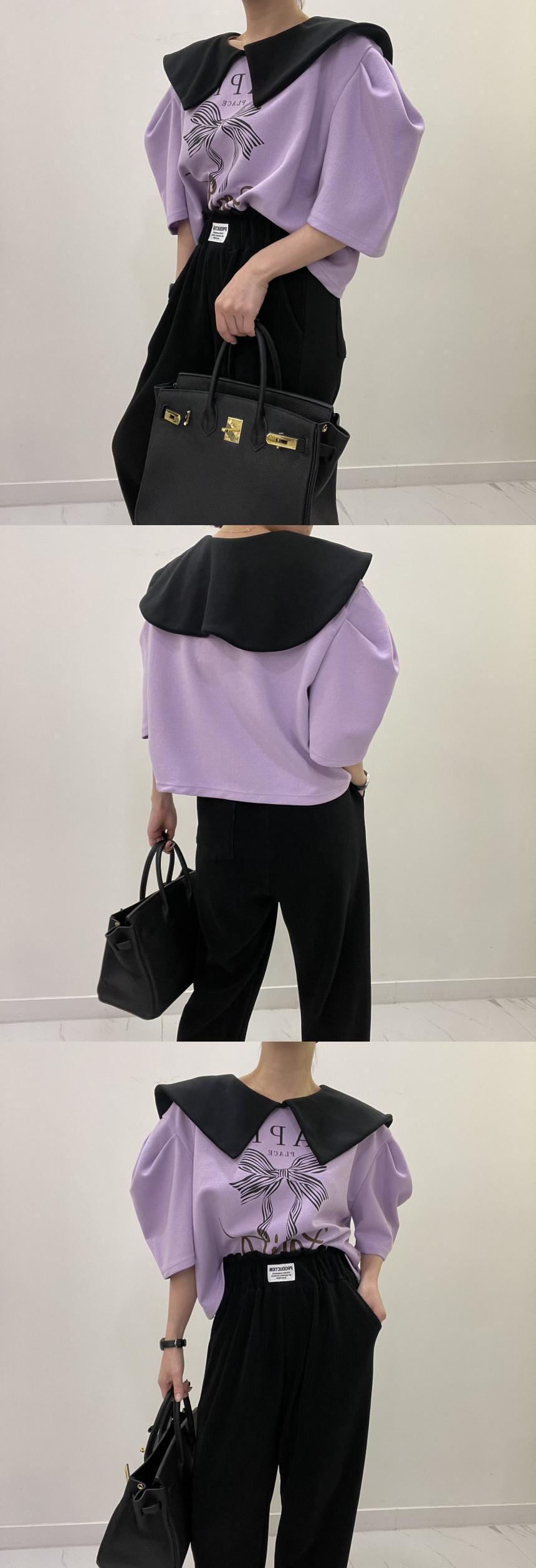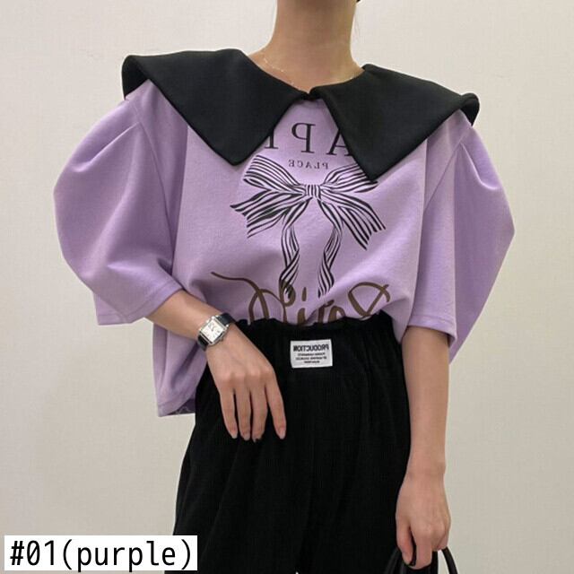 [EWQ] カラーコントラストラペルボウプリント Tシャツパフスリーブ Tシャツトップ夏レタールーズ Tシャツトップス 299 リボン サマー 夏物