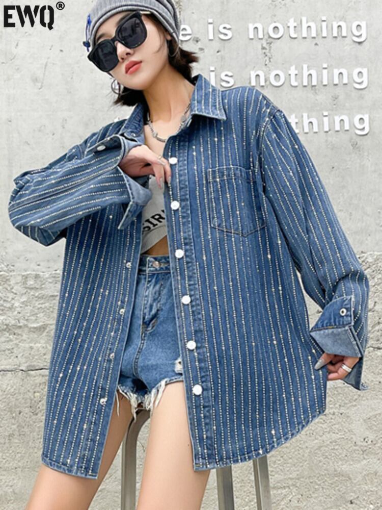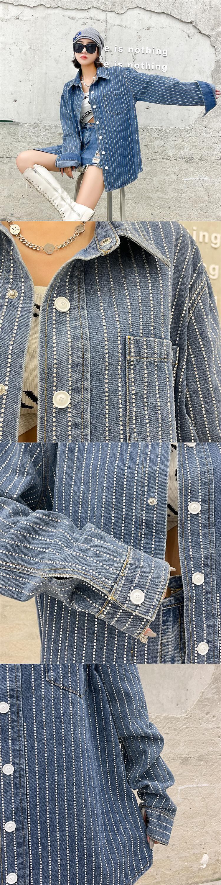 [EWQ] レディース ストライプ クリスタル デニム シャツ シングル ブレスト コントラスト カラー ロング スリーブ ブラウス トップ 春 秋 トップス 長袖 スプリング 春物 オータム 秋物