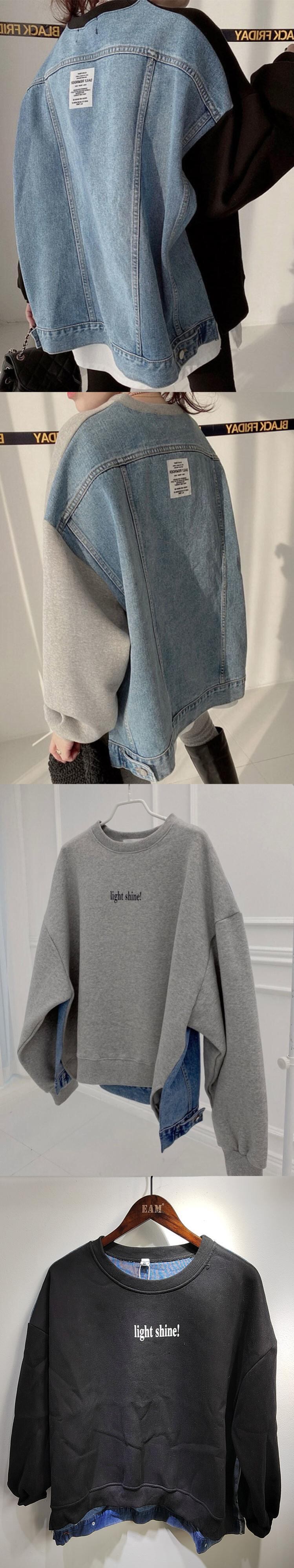 [EWQ] 秋春バック レター パッチ デニム スプライス ルーズ O ネック プルオーバー長袖トレーナー 16R557 ロング スプリング 春物 オータム 秋物 Oネック