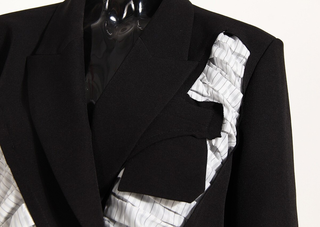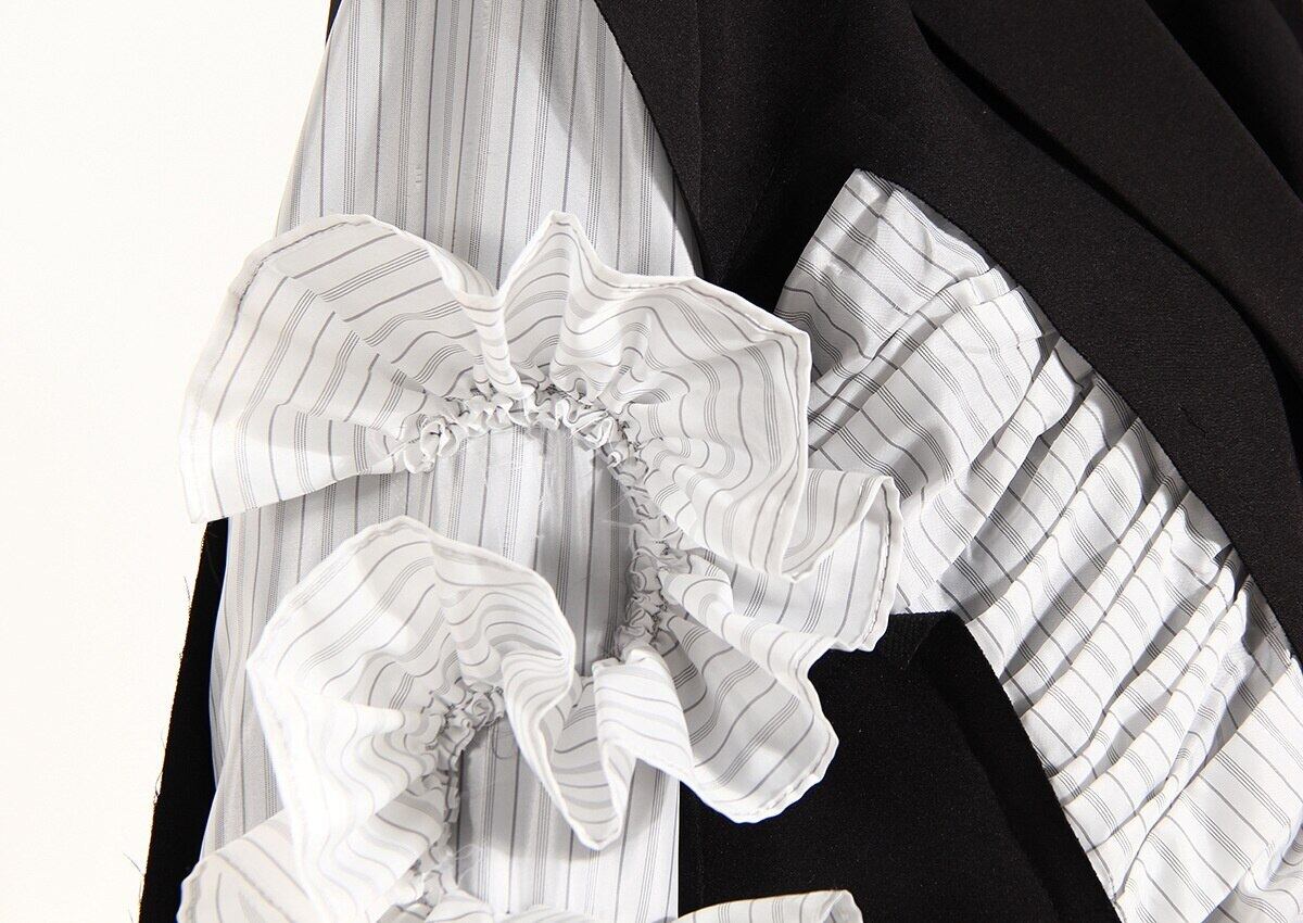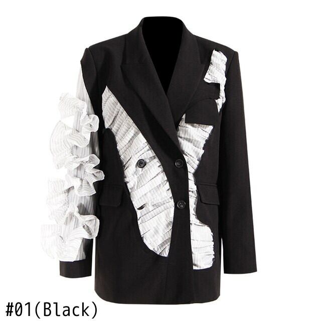 【EWQ】長袖パッチワークフリルレディースストライプスーツストライプトップスオフィスレディブレザープリーツフラワーカッティングコート春 ロング スプリング 春物 フラワーデザイン 会社 学校 通勤や通学にも