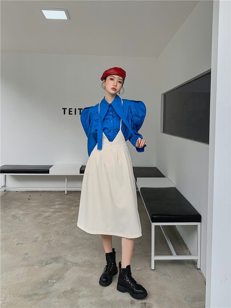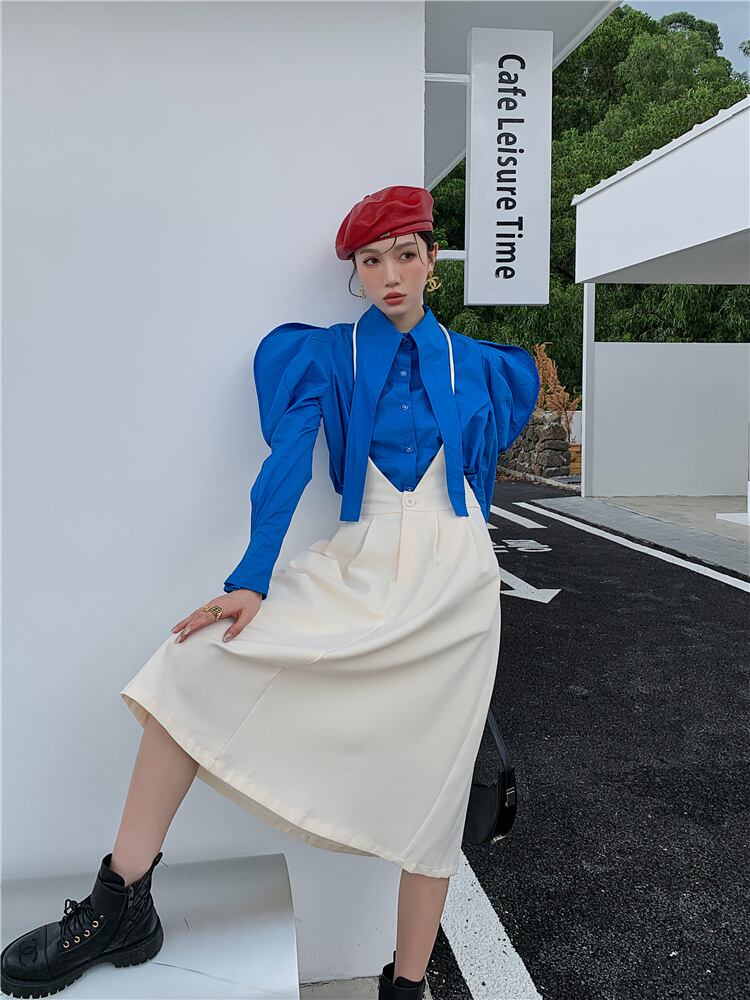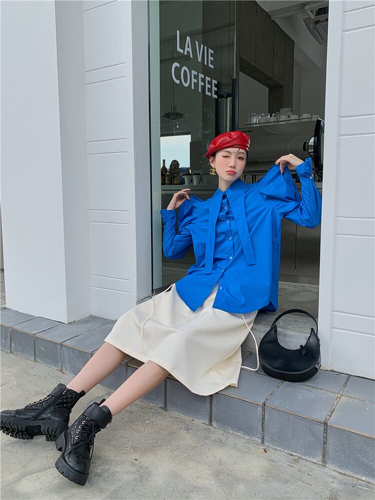 [EWQ] ブルーバブルスリーブシャツロング包帯襟ブラウストップ春秋シングルブレストトップス 6885 スプリング 春物 オータム 秋物