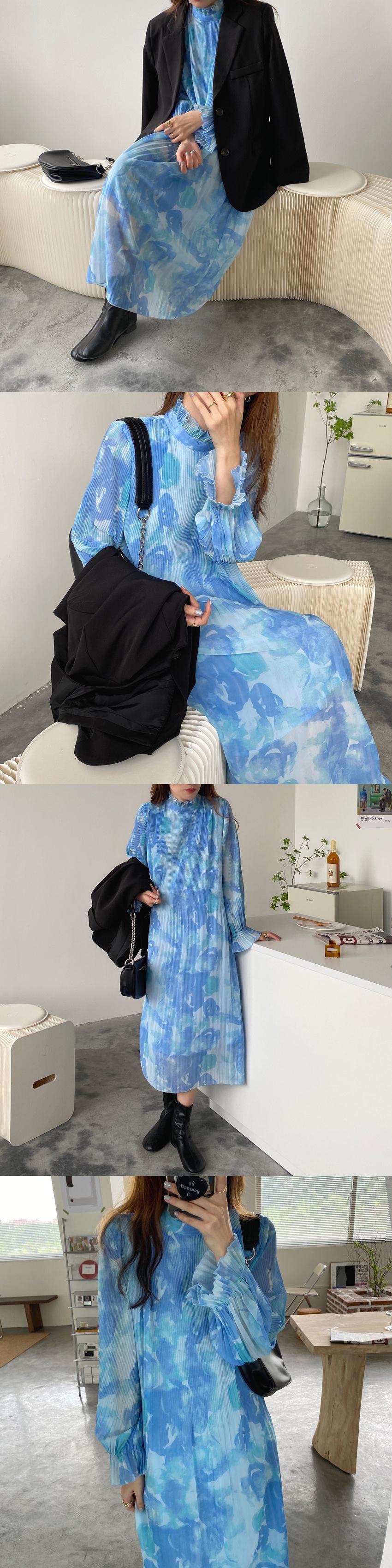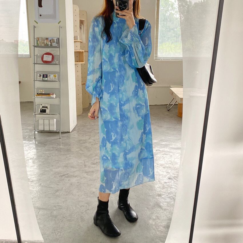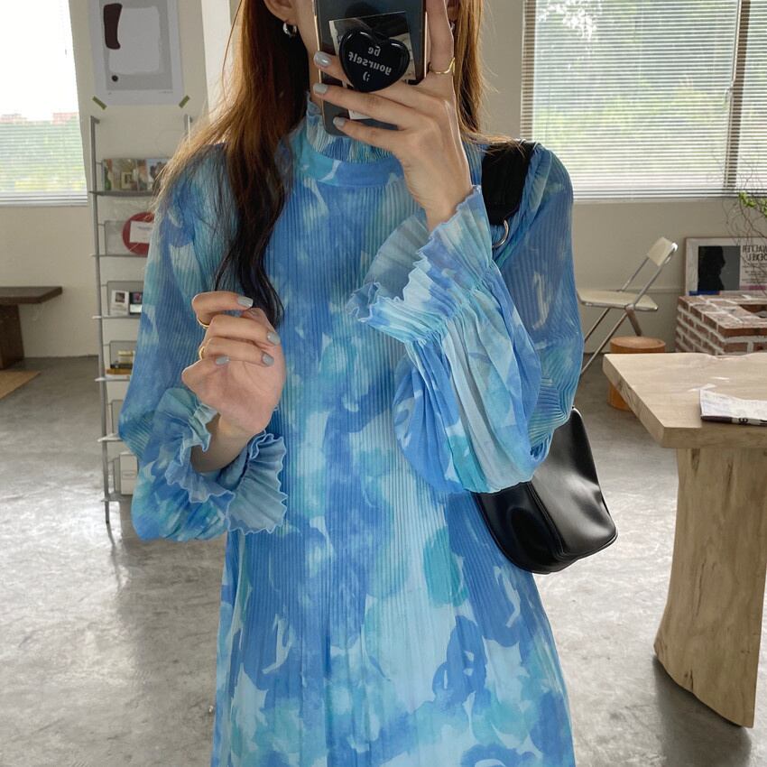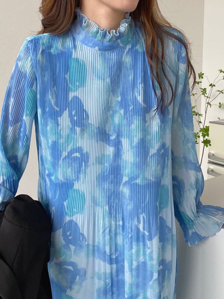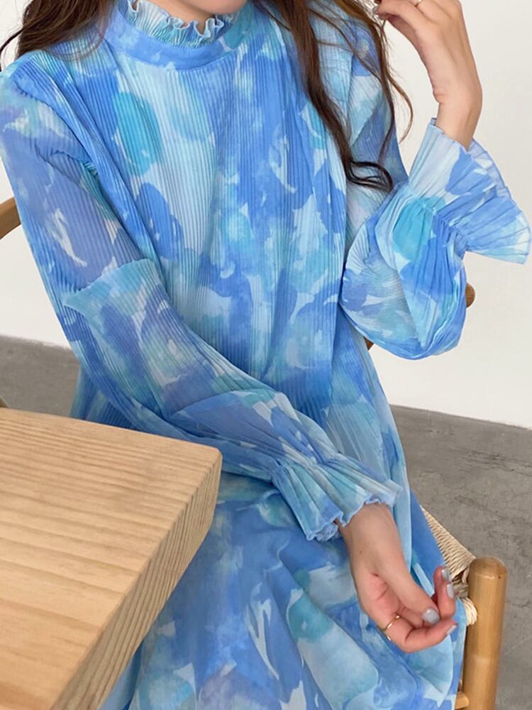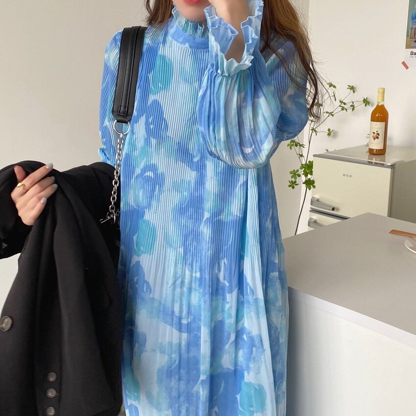 [EWQ] 甘い潮染料スタンドネックドレスプリントプリーツマキシドレス春夏パーティーフリルシフォン Vestido 大人ガーリー スウィート キュート カジュアル スプリング 春物 サマー 夏物
