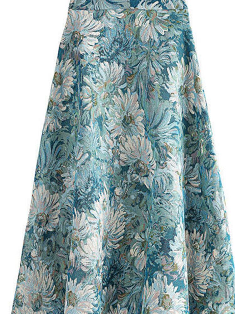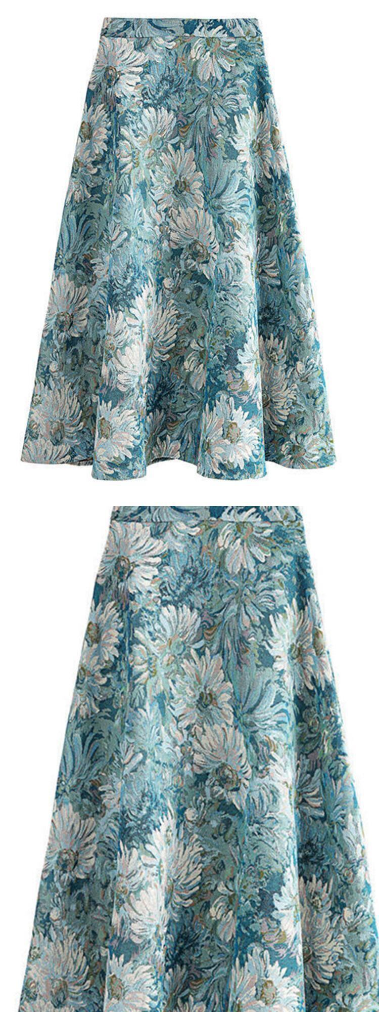 [EWQ] ジャカード プリント A ライン スカート花コントラスト ウエスト ミッドカーフ スカート春夏ファルダス 08 スプリング 春物 サマー 夏物 Aライン フラワーデザイン