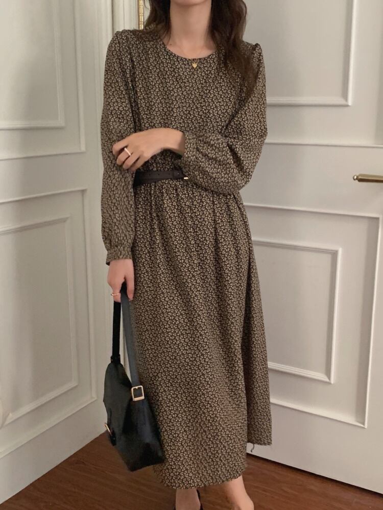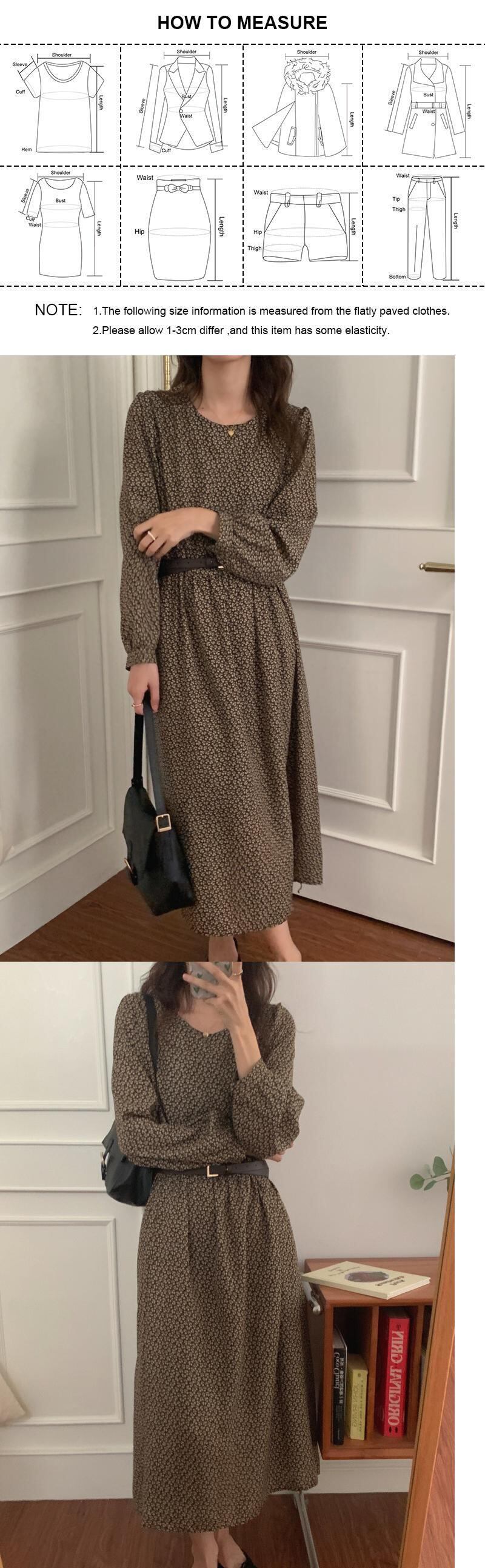 [EWQ] パッチワーク コントラスト カラー フラワー スリム ドレス レディース ベルト Oネック パフ スリーブ ドレス 春 スプリング 春物 ハーネス フラワーデザイン