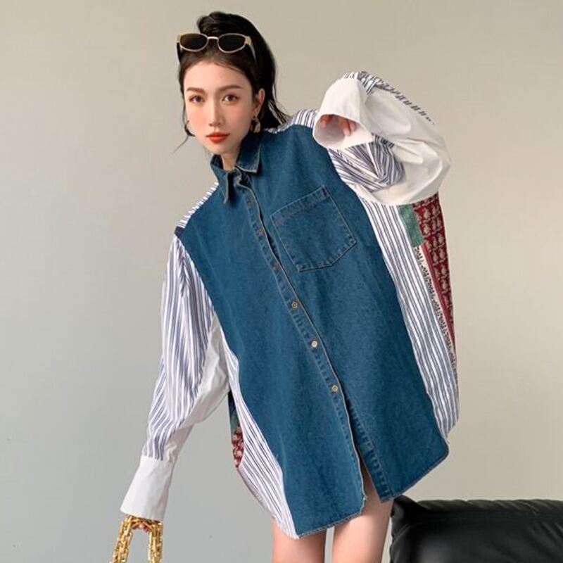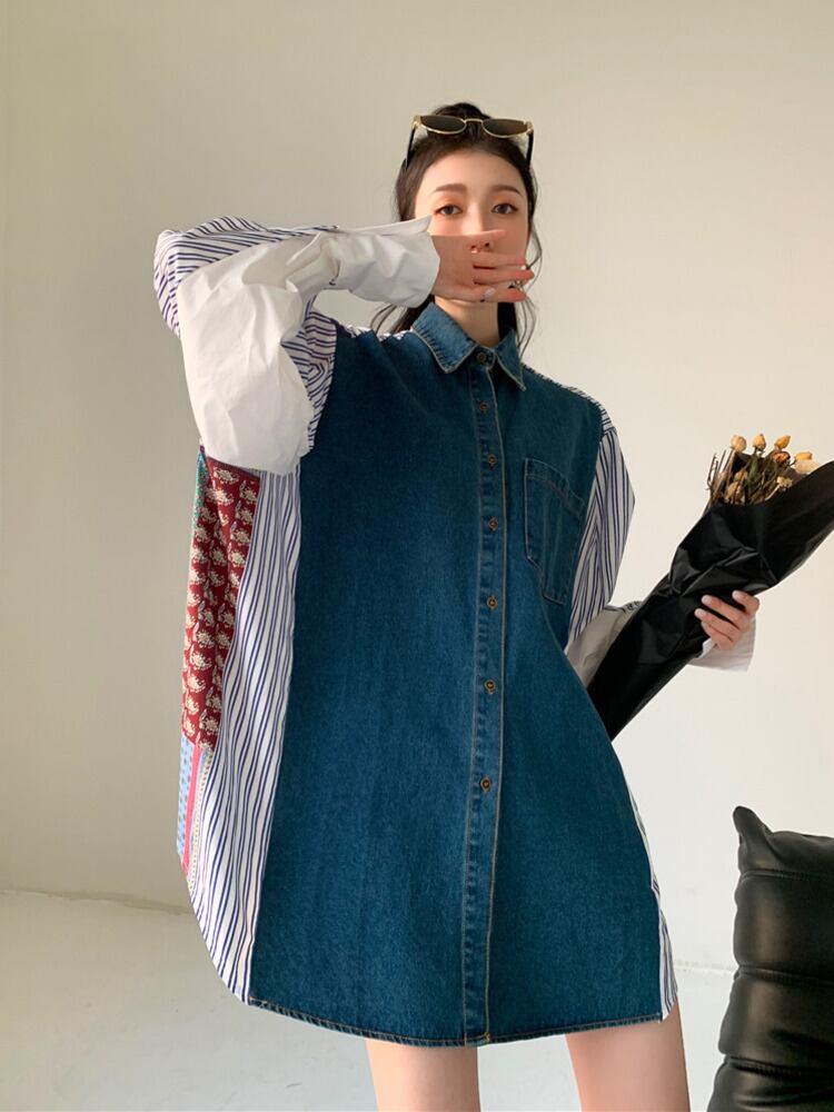【EWQ】 春 ゆったり ターンダウン カラー シングルブレスト パネル プリント ロングスリーブ ストレート シャツワンピース 8Y047 長袖 スプリング 春物