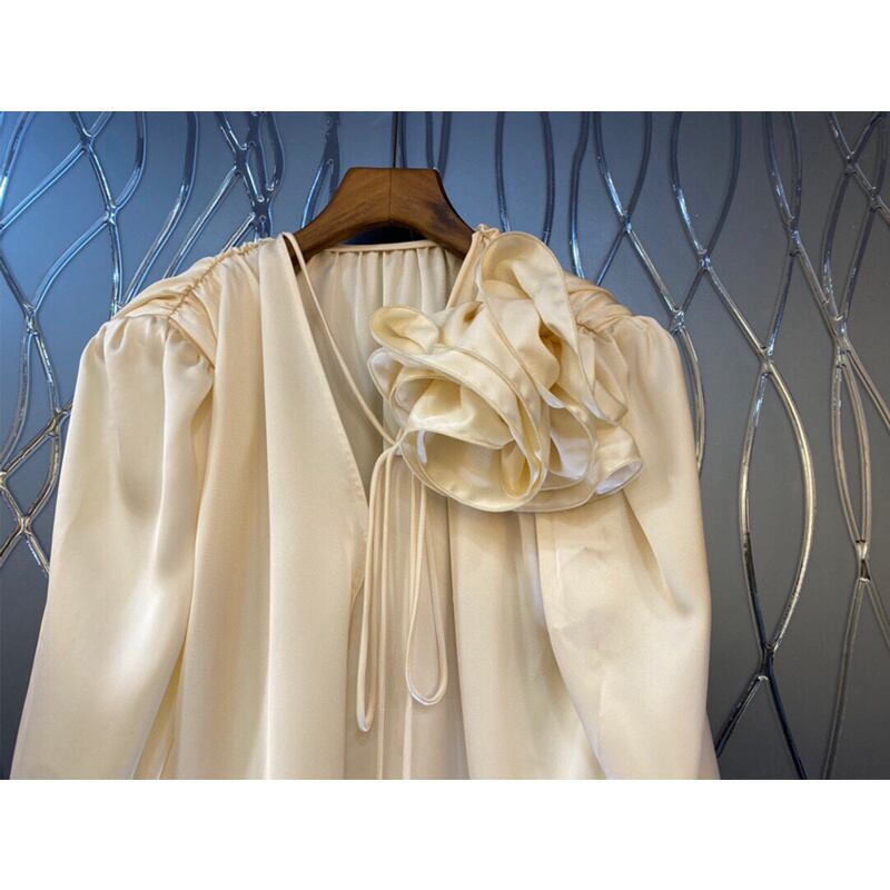 [EWQ] ビッグサイズ シャツ レディース フラワー トップス 秋 春 Vネック 長袖 包帯 ゆったり ブラウス シック ロング スプリング 春物 オータム 秋物 フラワーデザイン