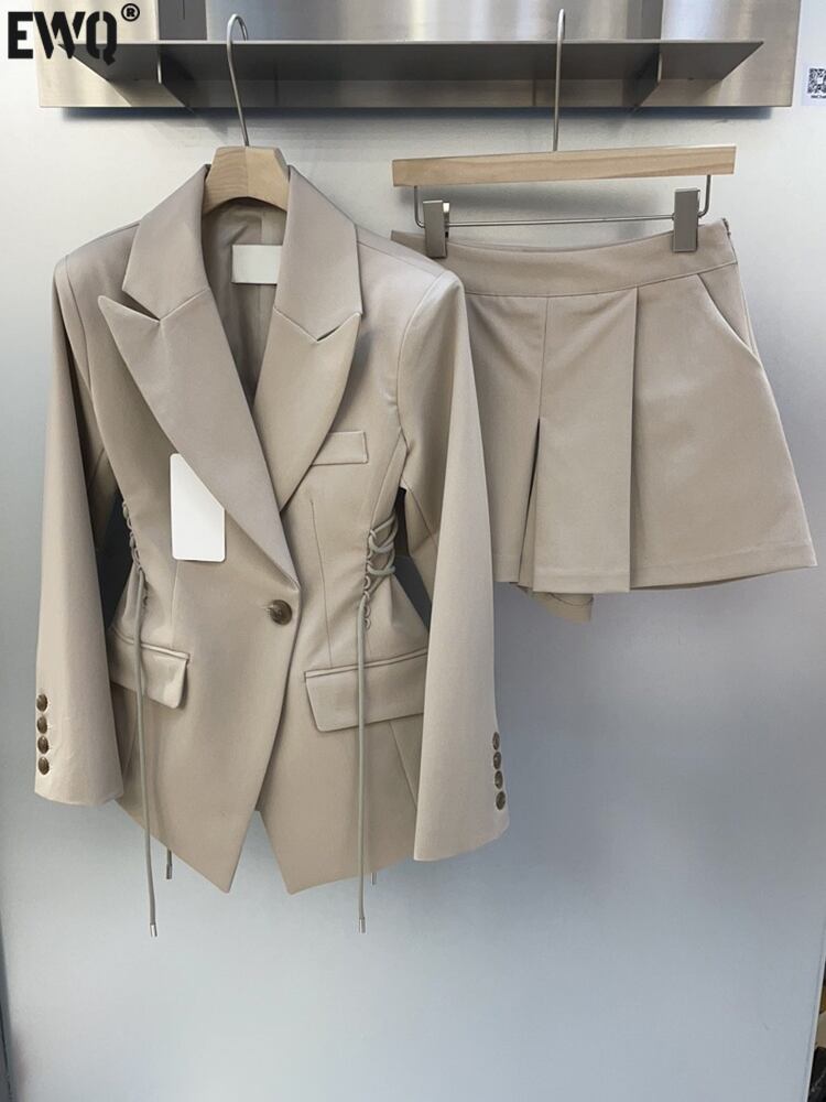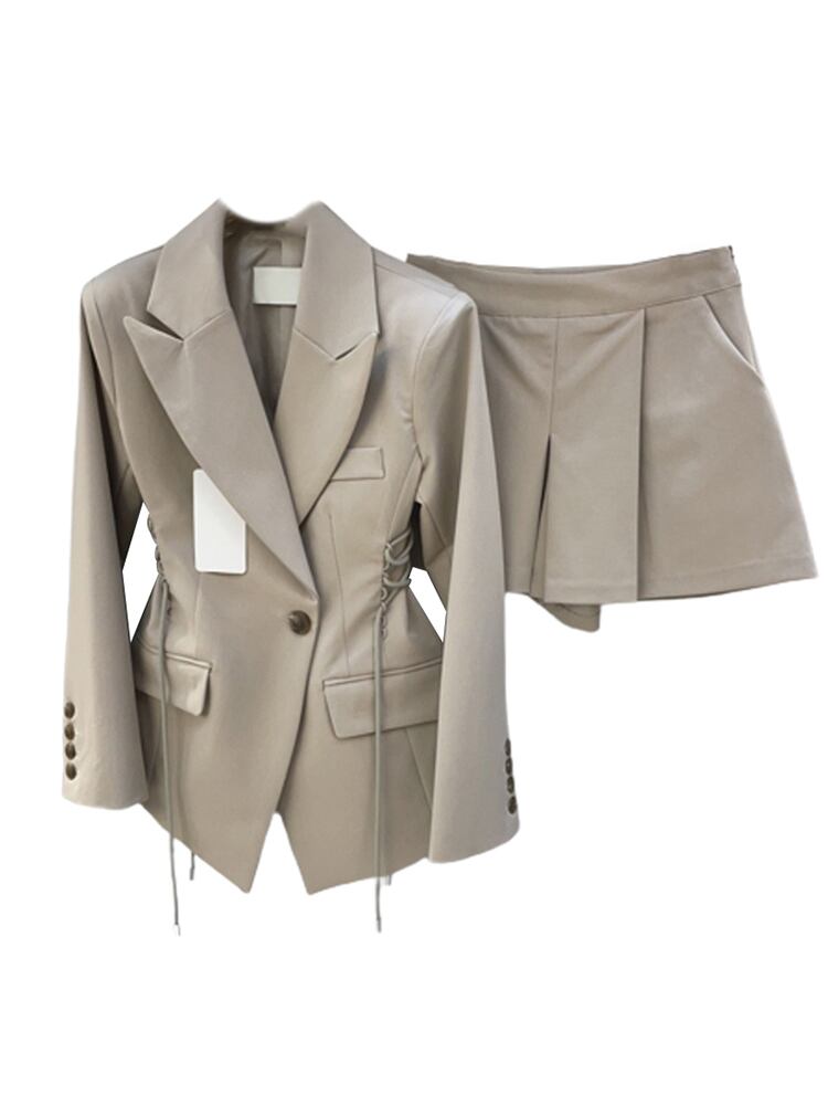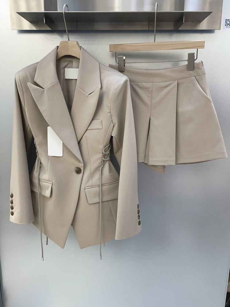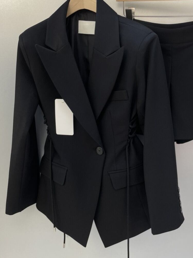 [EWQ] 巾着ラプルブレザーコート + ハイウエストプリーツショーツツーピーススーツ夏セット 591 ハイウェスト サマー 夏物 ブルマー