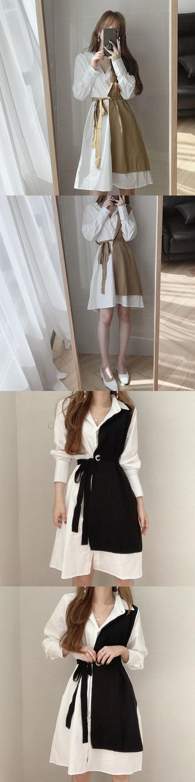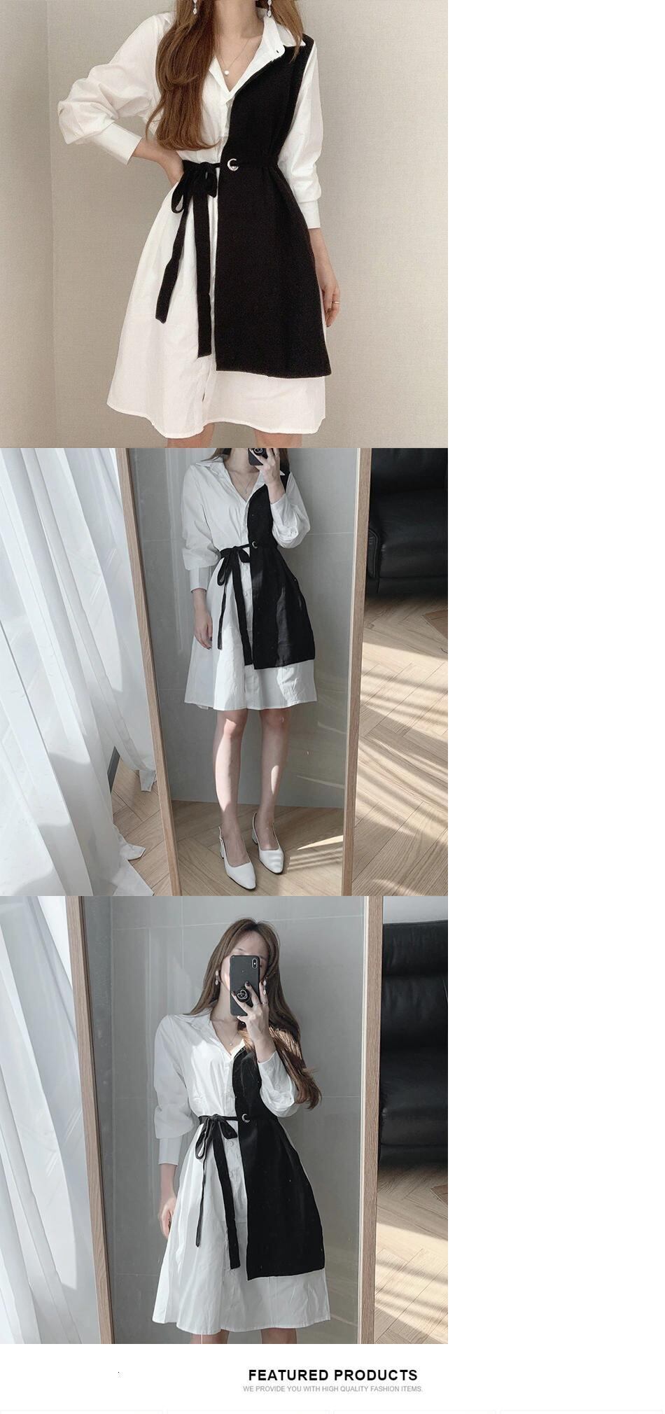 [EWQ] 甘いコントラスト カラー バブル スリーブ ドレス春シックレースアップ スプライシング A ライン ドレス 16Y5772 大人ガーリー スウィート キュート カジュアル スプリング 春物 Aライン